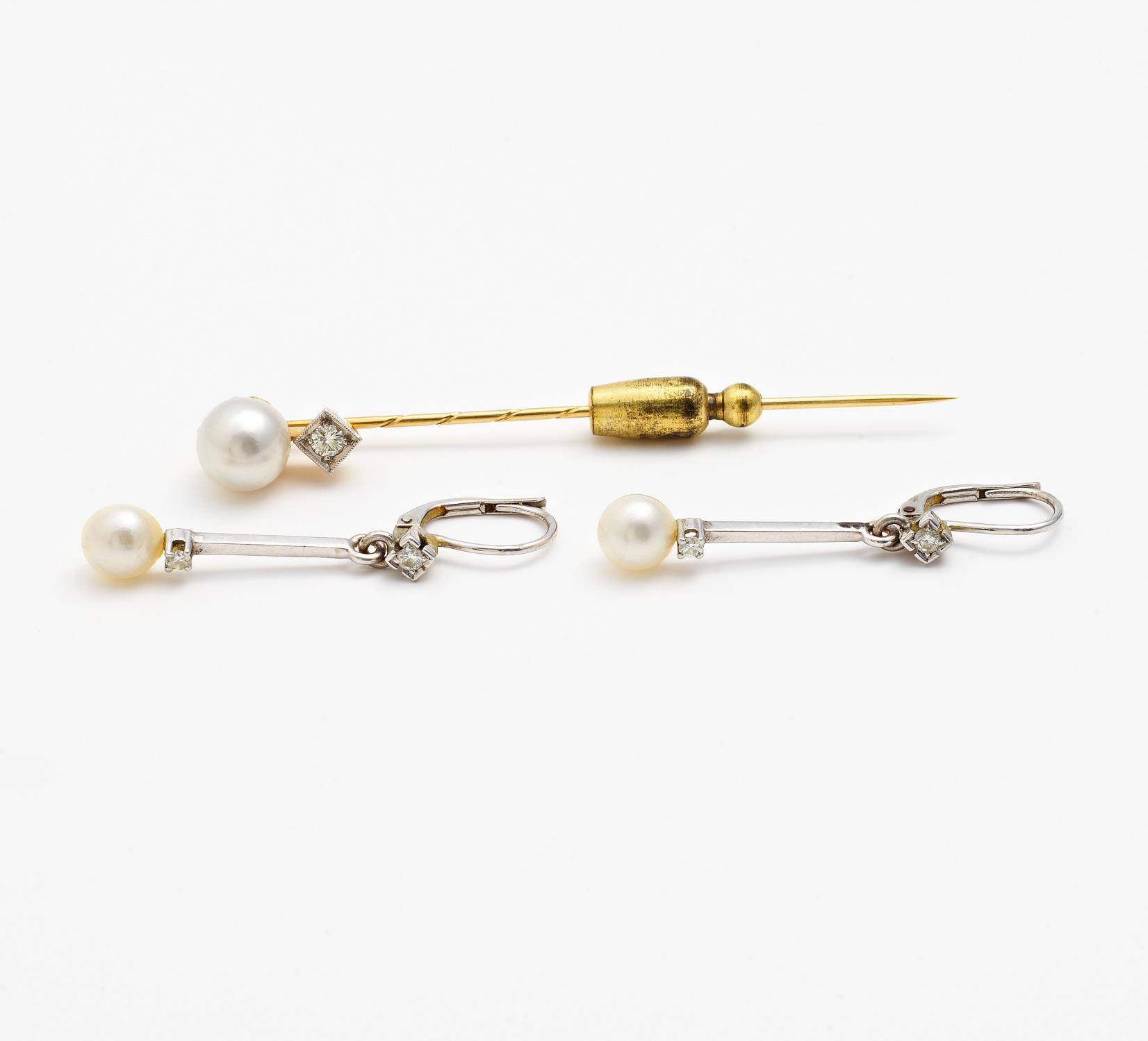 Konvolut: Reversnadel und Ohrgehänge mit Zuchtperl-Diamantbesatz.