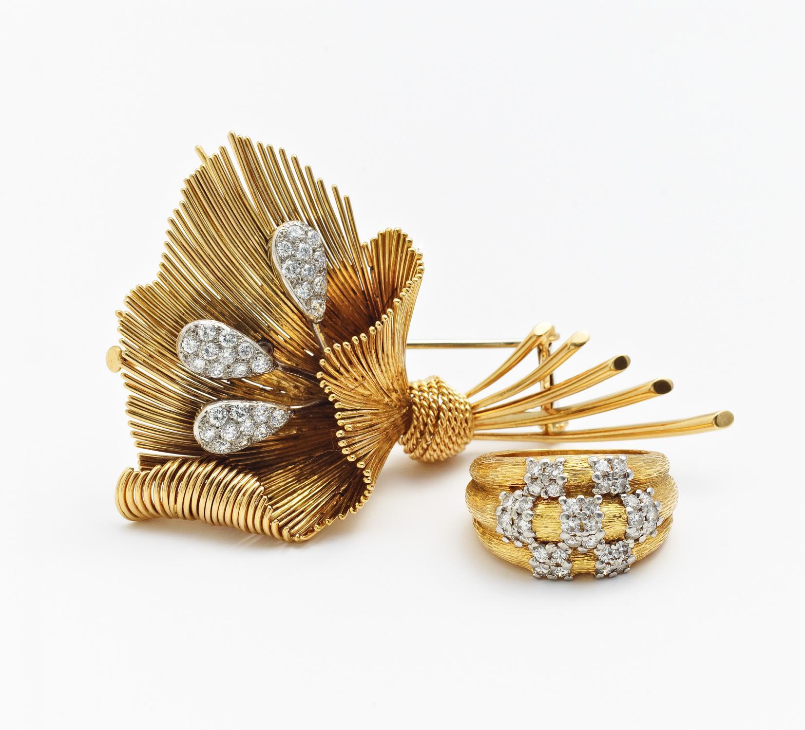 Set: Brosche und Ring mit Diamantbesatz.