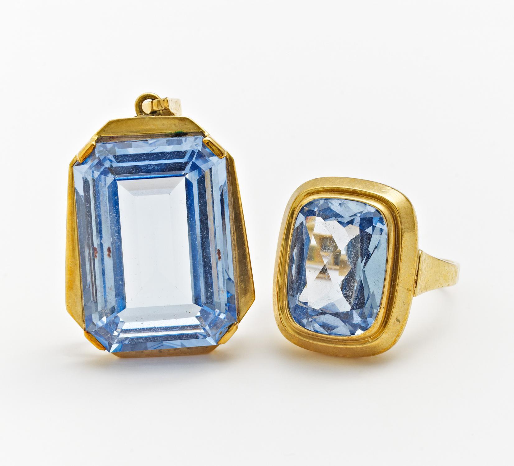 333/- Gelbgold, gestempelt. 18,2g. 1 facettierter Blautopas im Scherenschliff D. 16 x 12mm, 1 facettierter Blautopas im Treppenschliff D. 25 x 17mm, EU-RM: 61. Ringtop: H x B=21 x 17mm, Anhänger: H x B=3,8 x 2,1cm (inkl. Öse).~ Blautopase beh. Deutschland, um 1960.