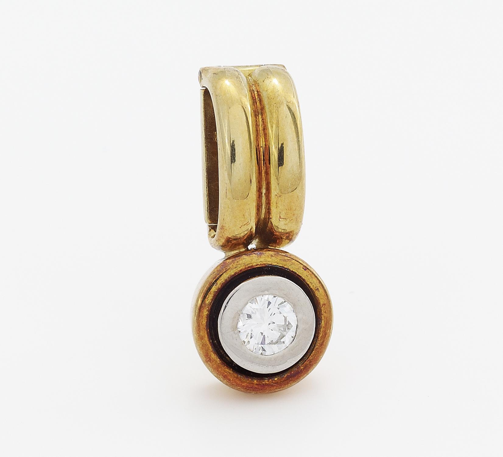 585/- Gelb-/Weißgold, gestempelt. 4,8g. 1 Brillant D. ca. 4,2mm, H x B=2,3 x 1,0cm.~ Sign. Katzler.
