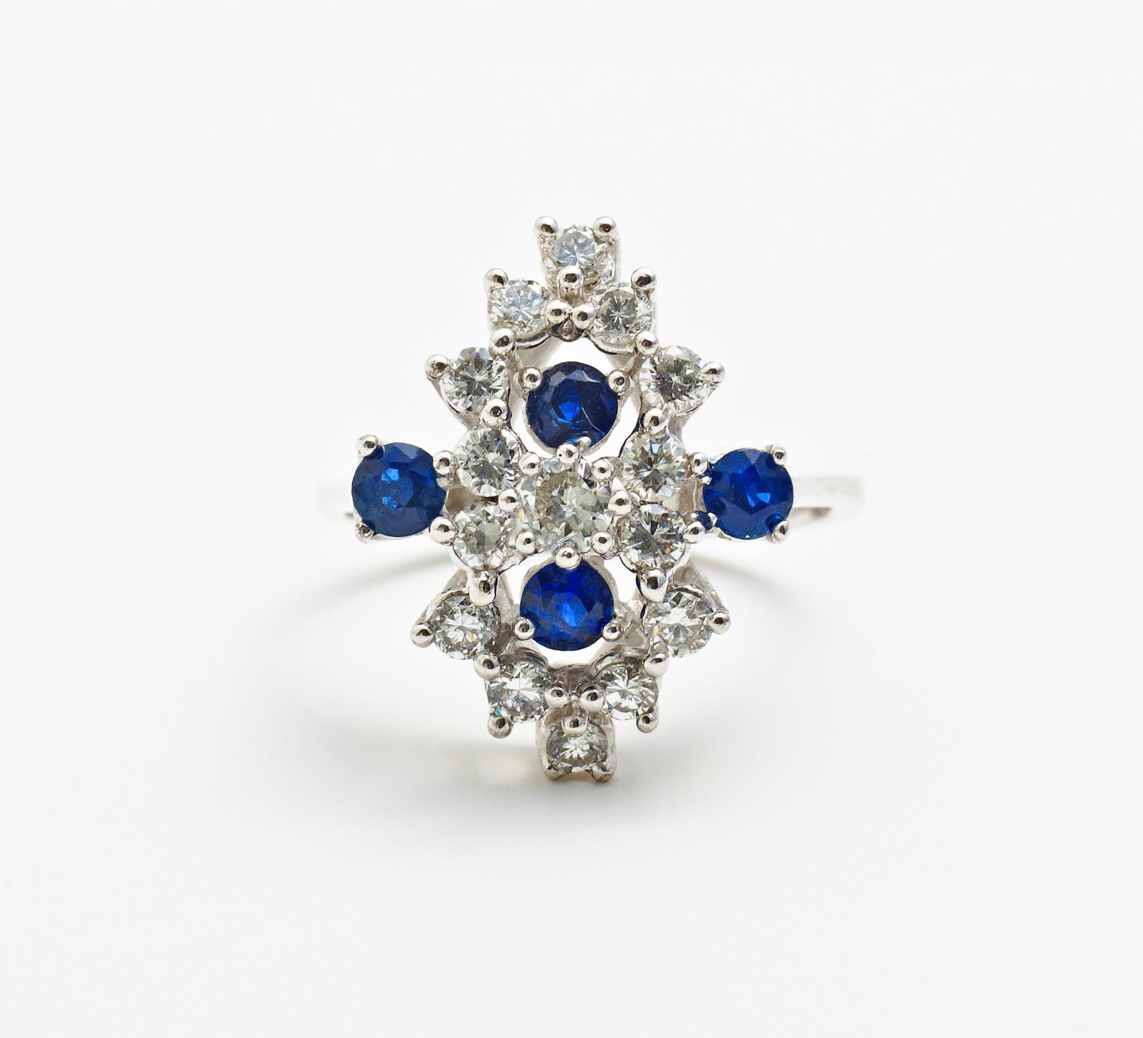Weißgold. 2,8g. 4 rund facettierte Saphire D. 2,9mm, 14 winzige Brillanten D. ca. 1,7mm, mittiger Brillant D. ca. 2,6mm, EU-RM: 46. Ringtop: H x B=16,8 x 13,4mm.~