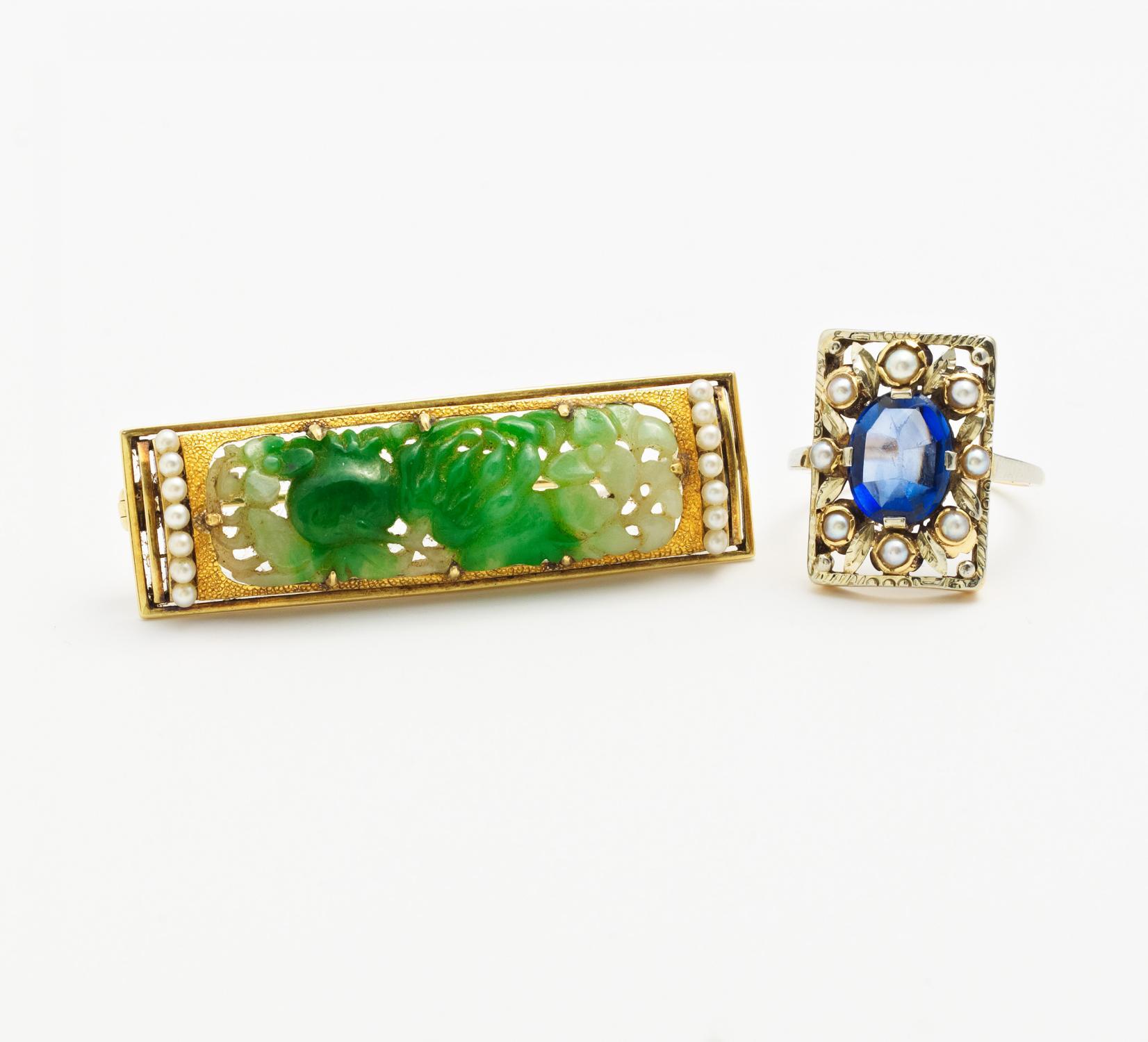 Brosche: Gelbgold; Ring: 585/- Rotgold, gestempelt (leicht verschlagen). 1.9,1g, 2.4,0g. 1 geschnitzte Jade-Platte ca. 3,5 x 1,1cm, 1 ovaler blauer Farbstein D. 9 x 8mm, 22 Saatperlen. EU-RM: 53. Ringtop: H x B=1,9 x 1,4cm, Brosche: L x B=4,7 x 1,4cm.~