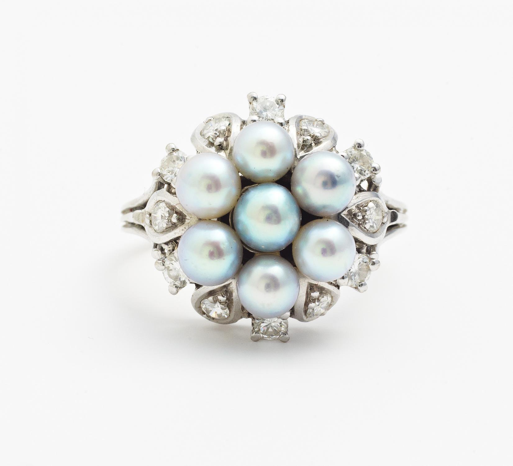 750/- Weißgold, gestempelt. 7,0g. 12 winzige Diamanten, 7 Süßwasser-Zuchtperlen D. ca. 4,5mm, grau-anthrazit. EU-RM: 58. Ringtop: D. ca. 17mm.~