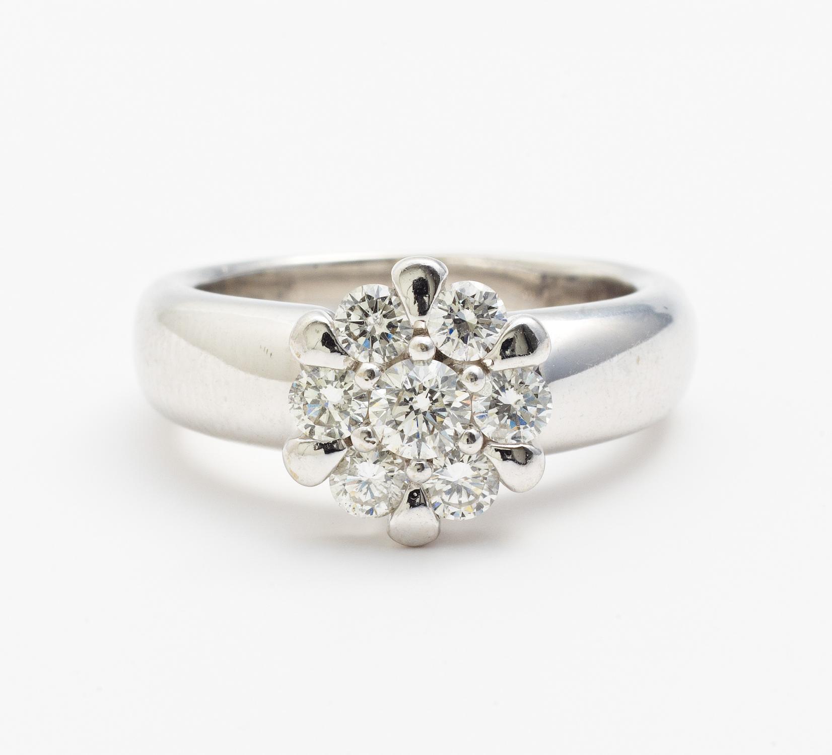 585/- Weißgold, gestempelt. 11,2g. 7 Brillanten D. 3-4mm, EU-RM: 56. Ringtop: D. 11,5mm.~