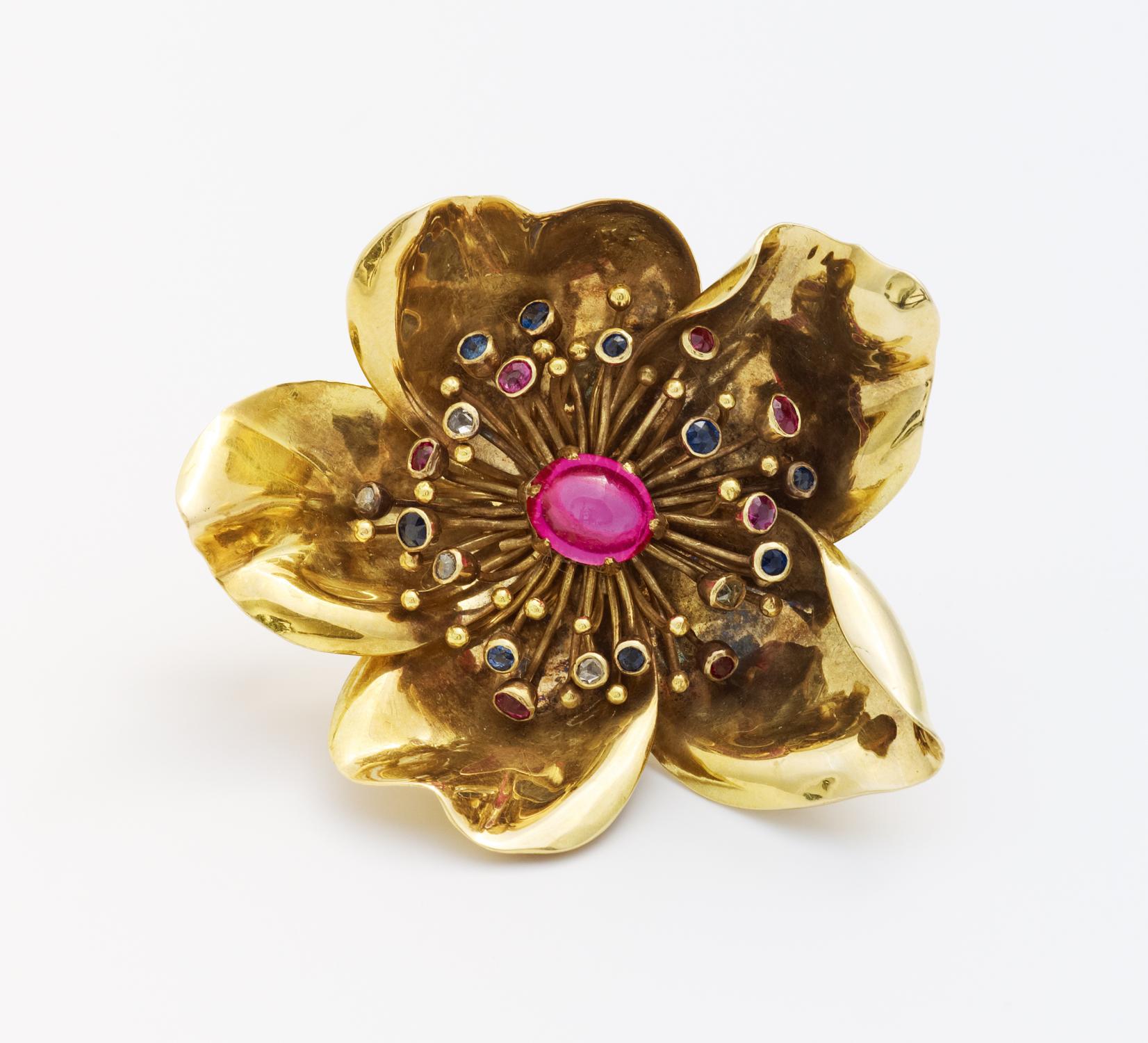 Blütenbrosche mit Saphir-Rubin-Diamantbesatz.
