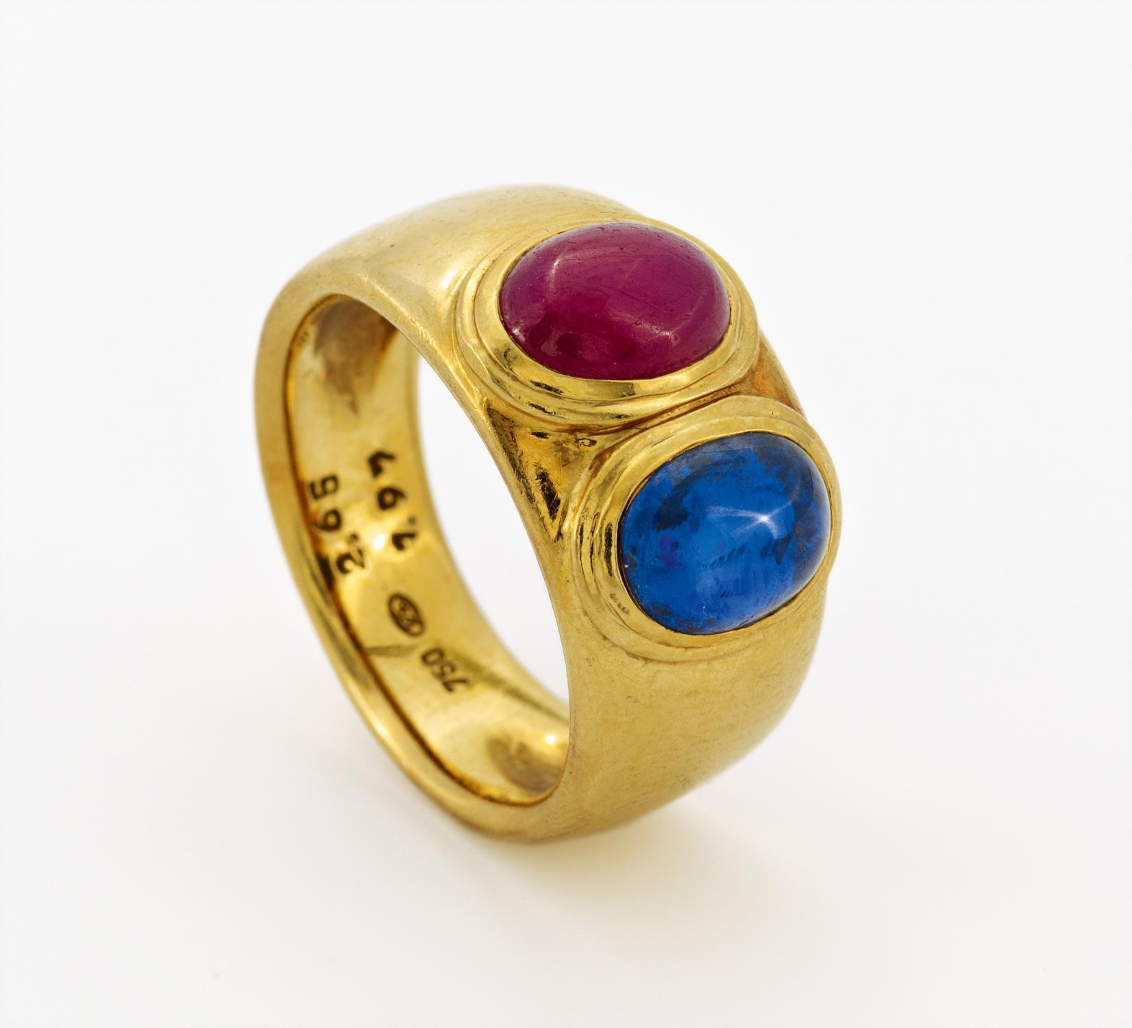 750/- Gelbgold. 12,5g. 1 ovaler Saphir-Cabochon, 1 ovaler Rubin-Cabochon, EU-RM: 54,5. Ringtop: 11,4 x 15,5mm.~