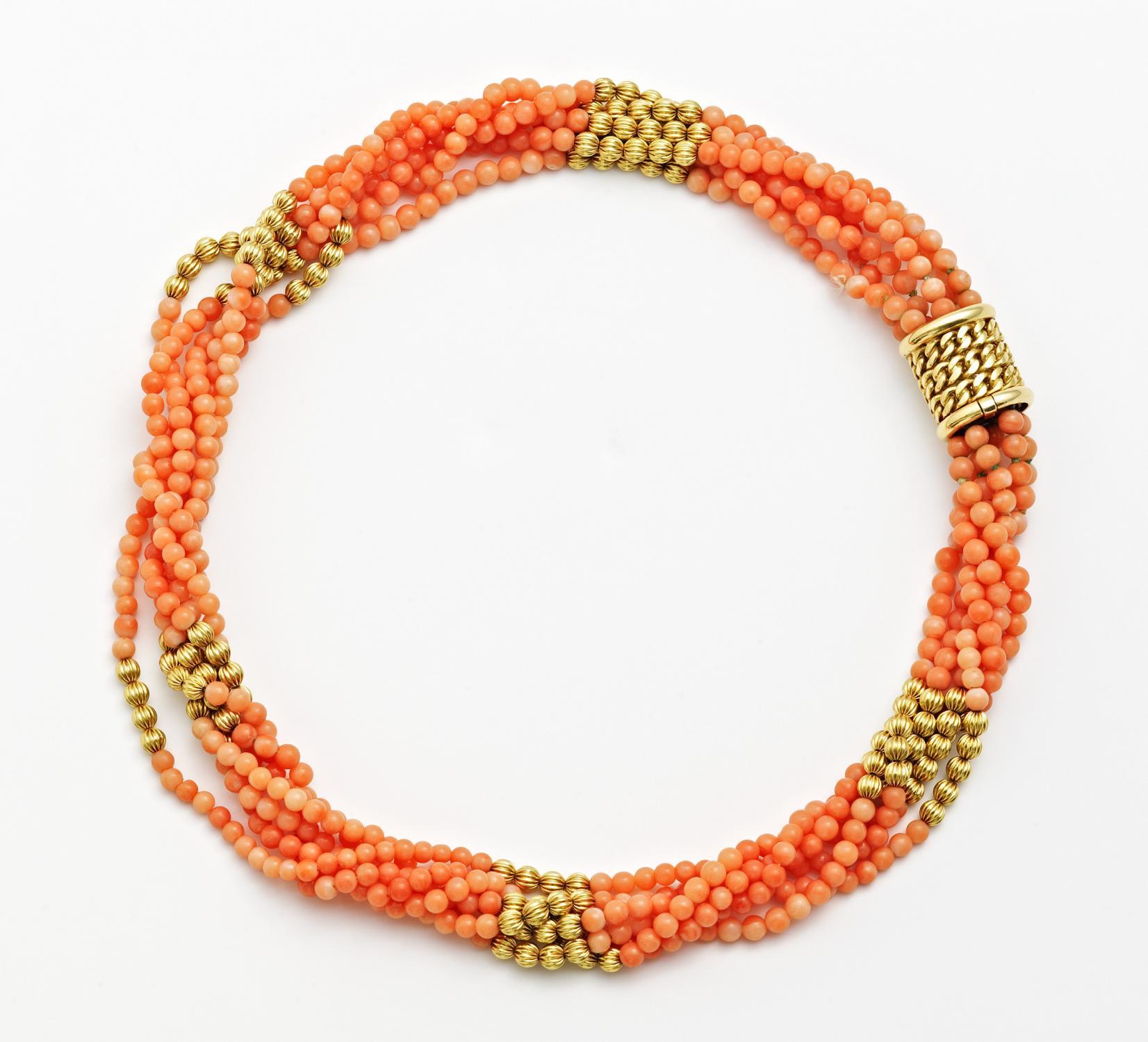 Verschluß Gelbgold, goldfarbene Zwischenelemente. 70,0g. 6 Korallperl Stränge. L x B=43,5 x 1,5cm.~ Länge variabel. Deutschland, um 1970.