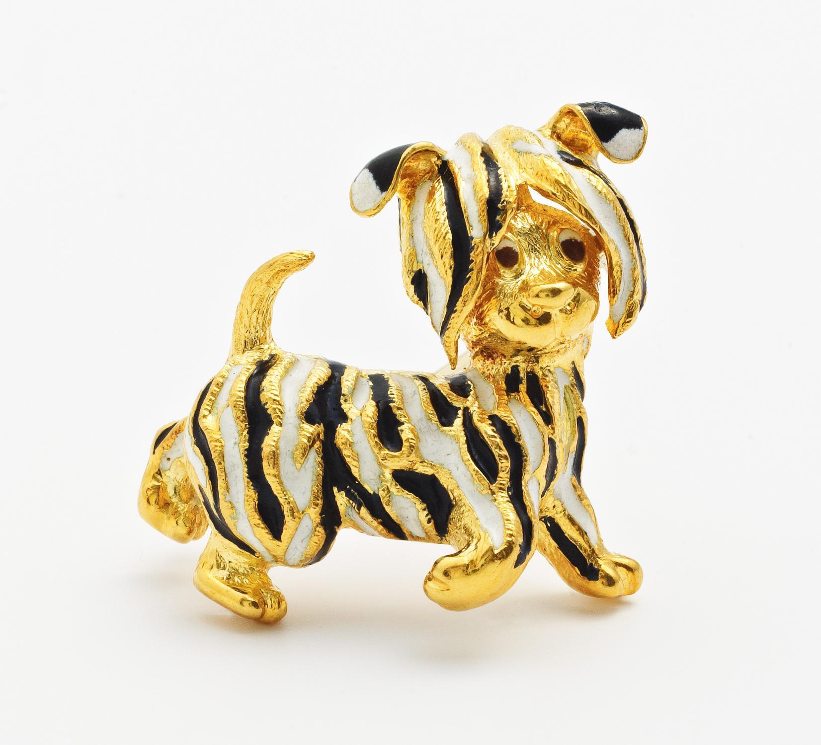 750/- Gelbgold, gestempelt; schwarzer und weißer Emaillack. 22,2g. H x B=3,5 x 3,8cm.~ Rückseitig CB signiert.