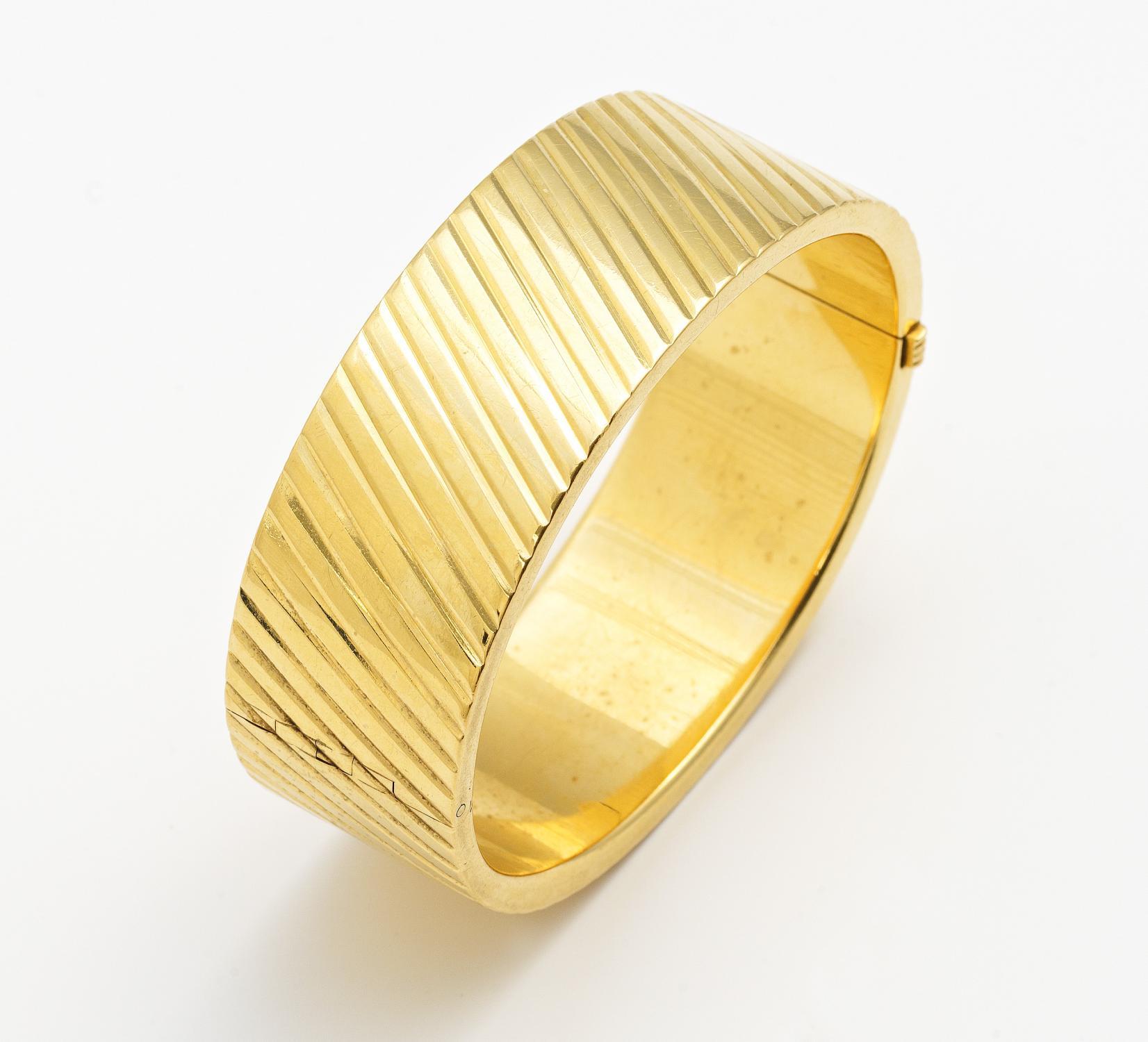750/- Gelbgold, gestempelt. 70,2g. Innendurchmesser D. 6,2cm, B. 2,2cm.~