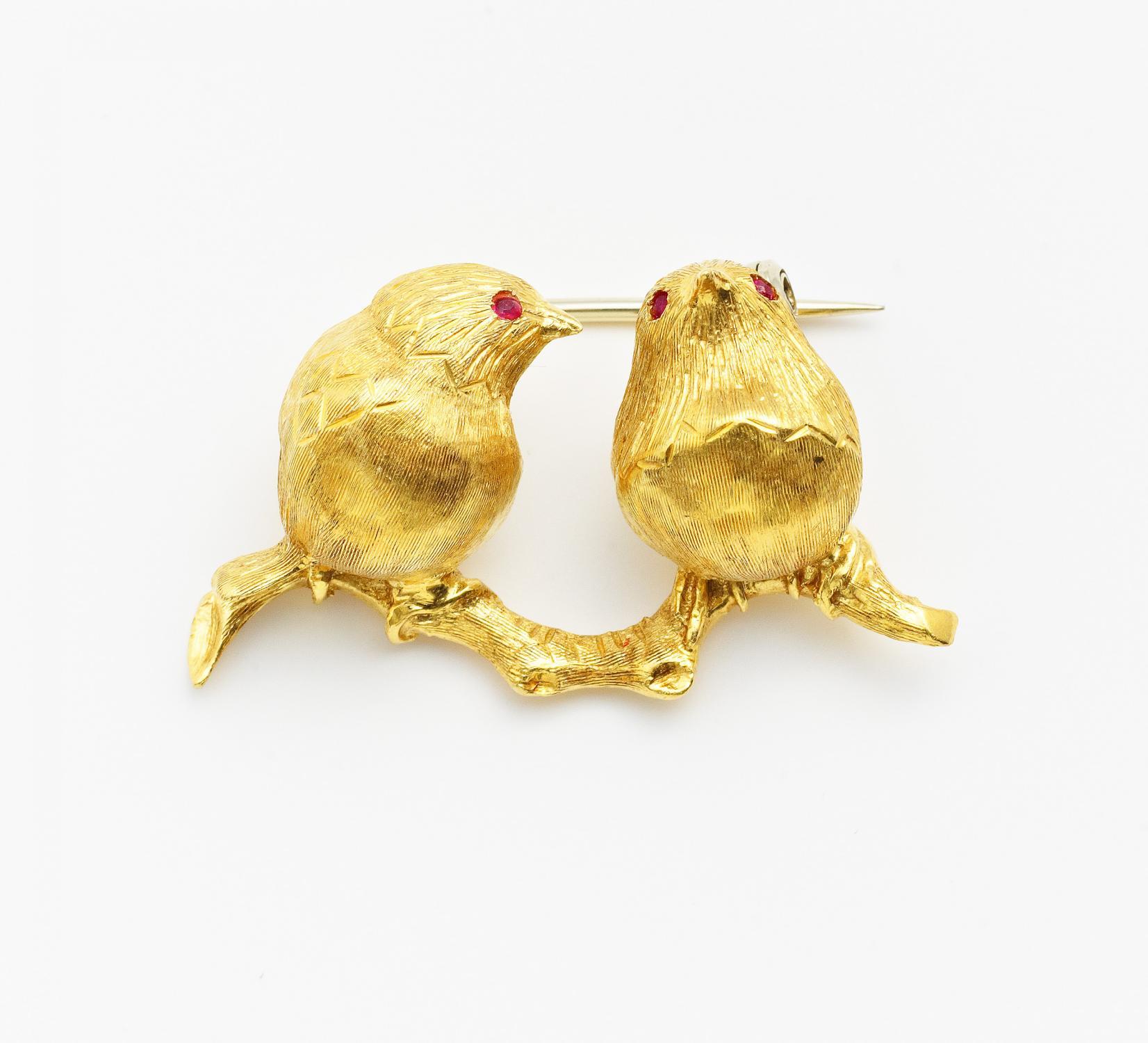 Gelbgold. 7,8g. 3 rund facettierte Rubine, L x B=3,2 x 1,7cm.~ Plastisch modelliertes Vogelpaar.