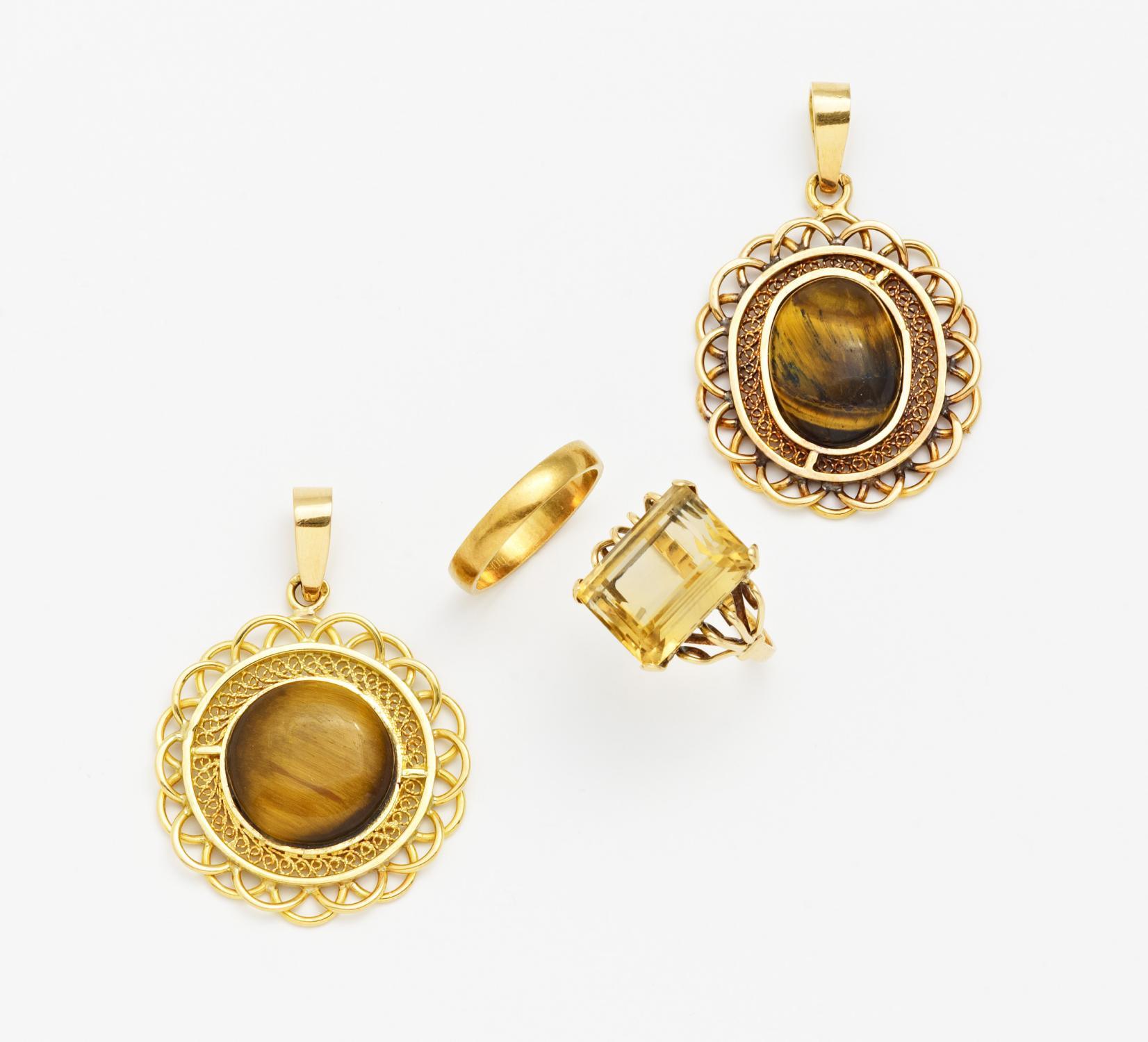 Anhänger: 750/- Gelbgold; Trauring: 900/- Gelbgold; Citrin-Ring: 750/- Gelbgold. Anhänger: 26,5g; Trauring: 4,8g; Citrin-Ring: 7,5g. 1 Tigerauge-Cabochon (rund) ca. 12,0ct, 1 Tigerauge-Cabochon (oval) ca. 13,0ct, 1 Citrin (achteck) ca. 13,0ct, EU-RM: 54, 58. Anhänger: H x B=3,9 x 3,4, 4,0 x 3,2cm, Ringtop Citrin-Ring: 1,7 x 1,8cm.~ Citrin lose.