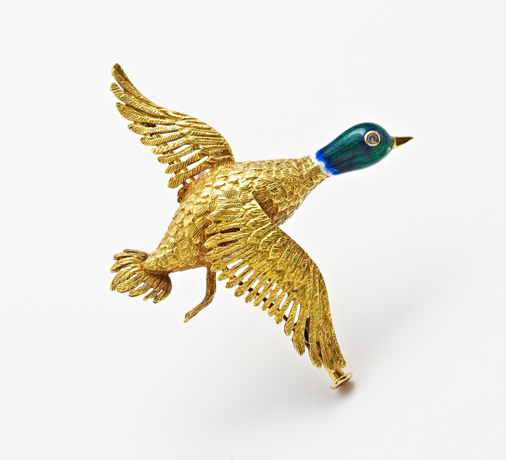 750/- Gelbgold, gestempelt; schwarzer, blauer und weißer Emaillack. 9,2g. 1 winziger 8/8-Diamant, H x B=4,6 x 4,0cm.~ Deutschland, um 1960.