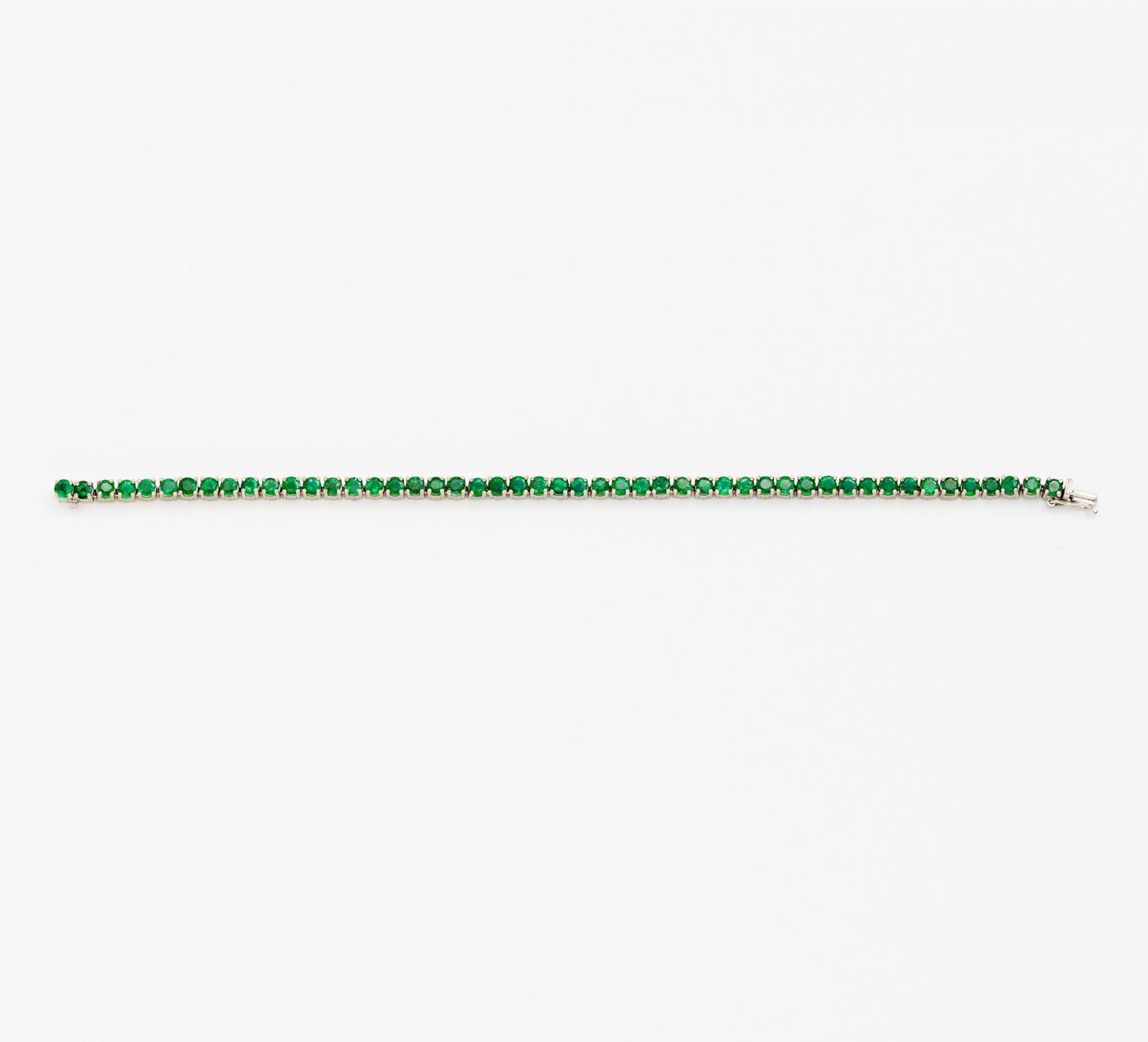 585/- Weißgold, gestempelt. 15,2g. 49 rund facettierte Smaragde D. 3mm, feine Farbe, L x B=19,0 x 0,3cm.~ Deutschland, um 1970.