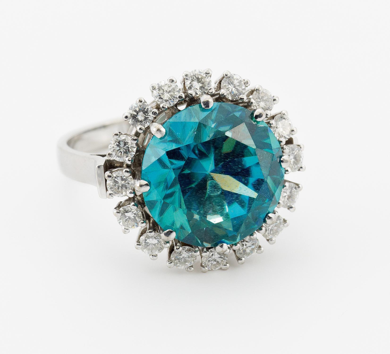 585/- Weißgold, gestempelt. 6,8g. 1 rund, facettierter Blautopas (behandelt) D. 12mm, 16 Brillanten D. ca. 1,9mm, EU-RM: 52,5. Ringtop: D. 17mm.~