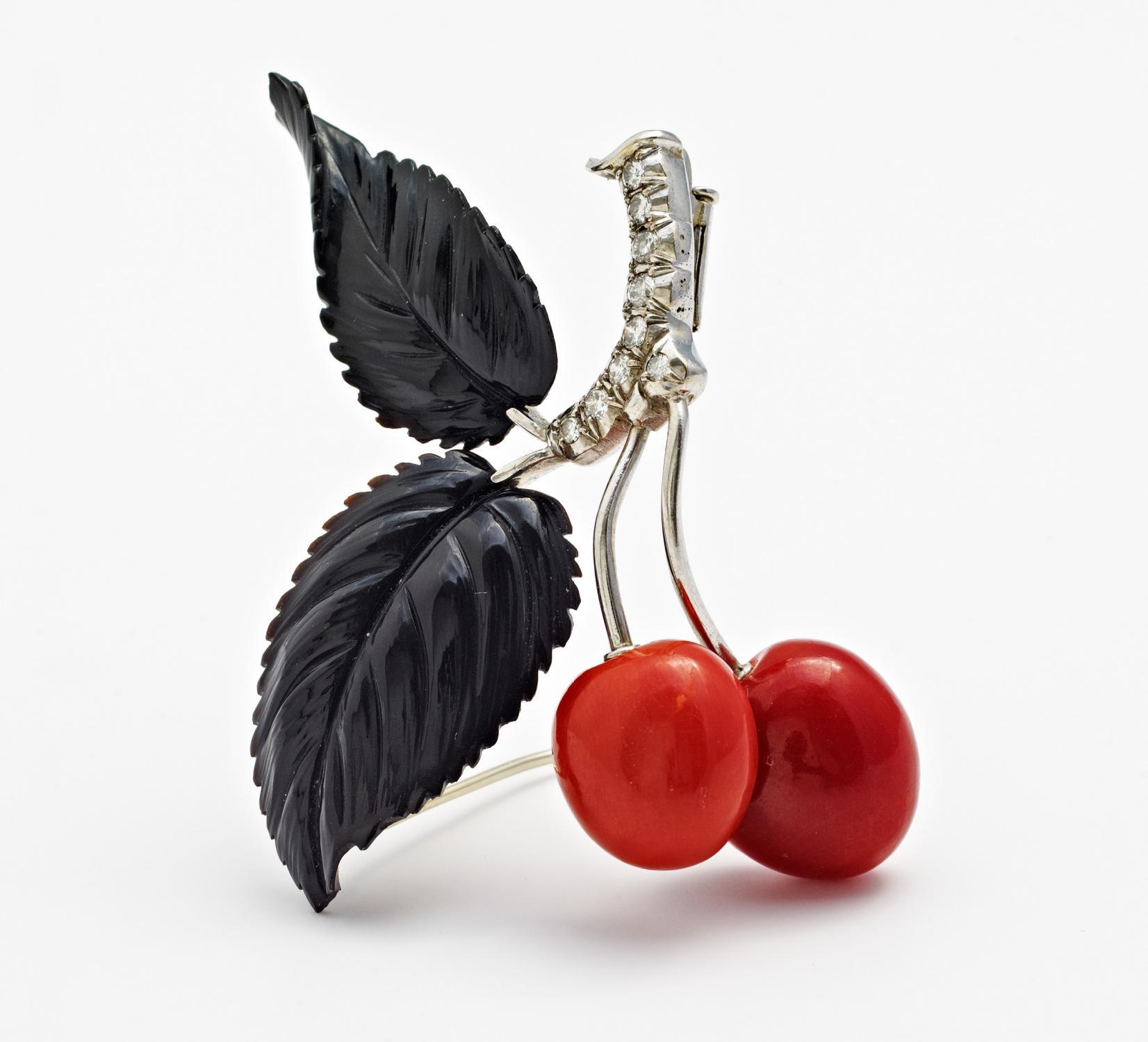 Weißgold. 22,2g. 2 rote Jaspis-Kugeln als Kirschen, 2 handgravierte schwarze Blätter (vermutl. Achat), 9 winzige Brillanten, H x B=ca. 5,2 x 4,0cm.~ Deutschland, um 1950.