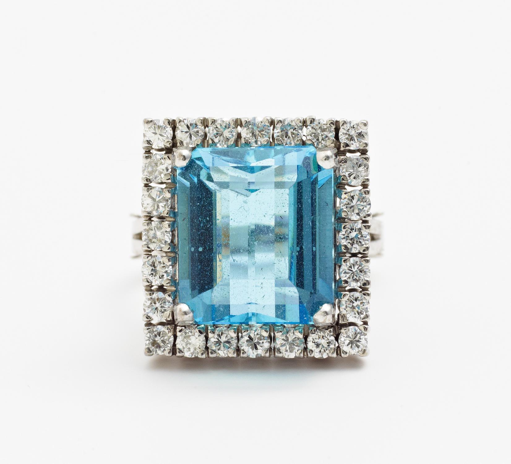 750/- Weißgold, gestempelt. 8,2g. 1 Aquamarin im Treppenschliff D. ca. 12 x 11mm, 24 winzige Diamanten, EU-RM: 52. Ringtop: H x B=17 x 16mm.~ Deutschland, um 1970.