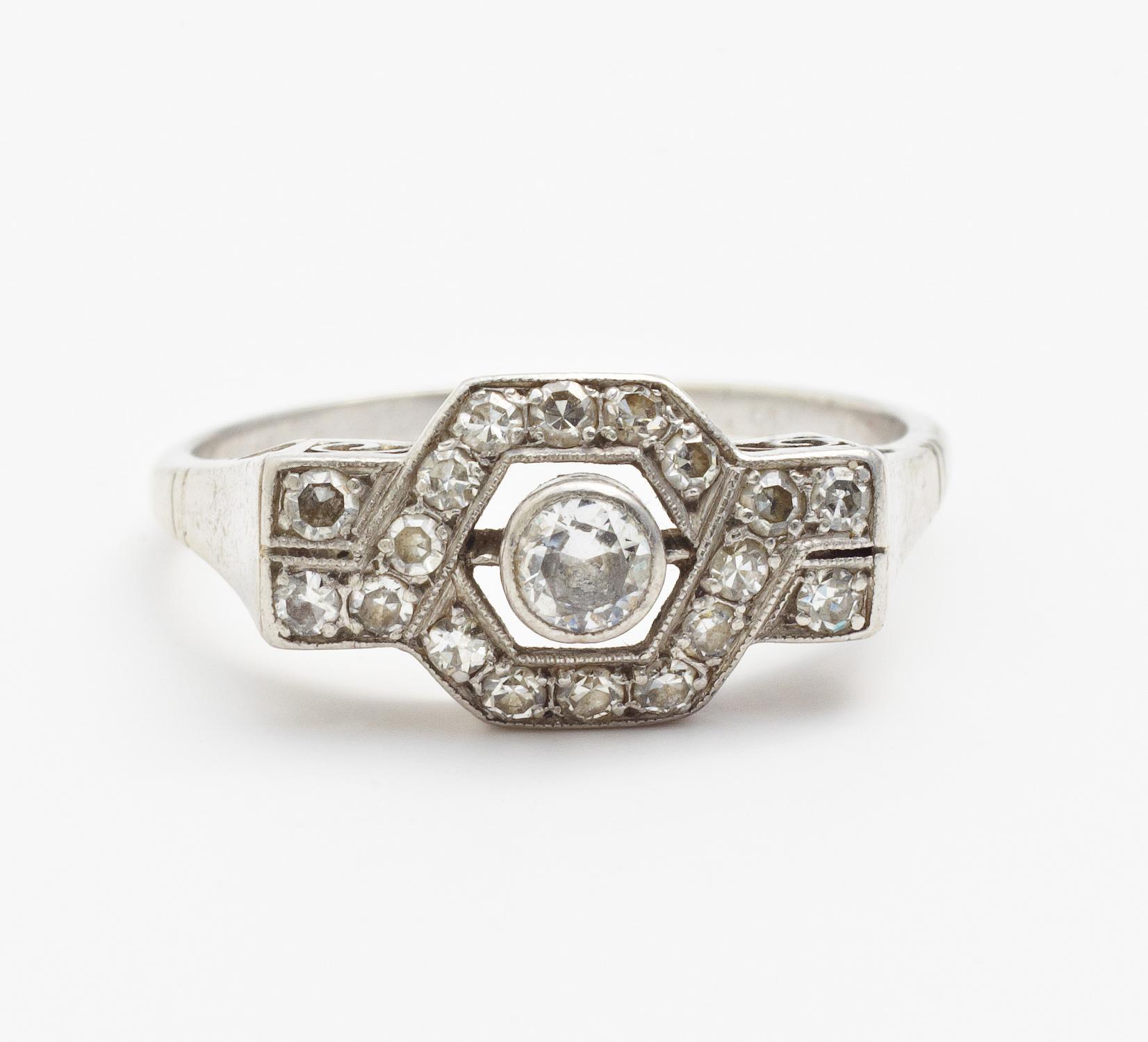 Silbern, Punze (leicht verschlagen). 2,8g. 18 winzige 8/8-Diamanten, 1 Altschliff-Diamant, EU-RM: 55. Ringtop: H x B=4 x 15mm.~