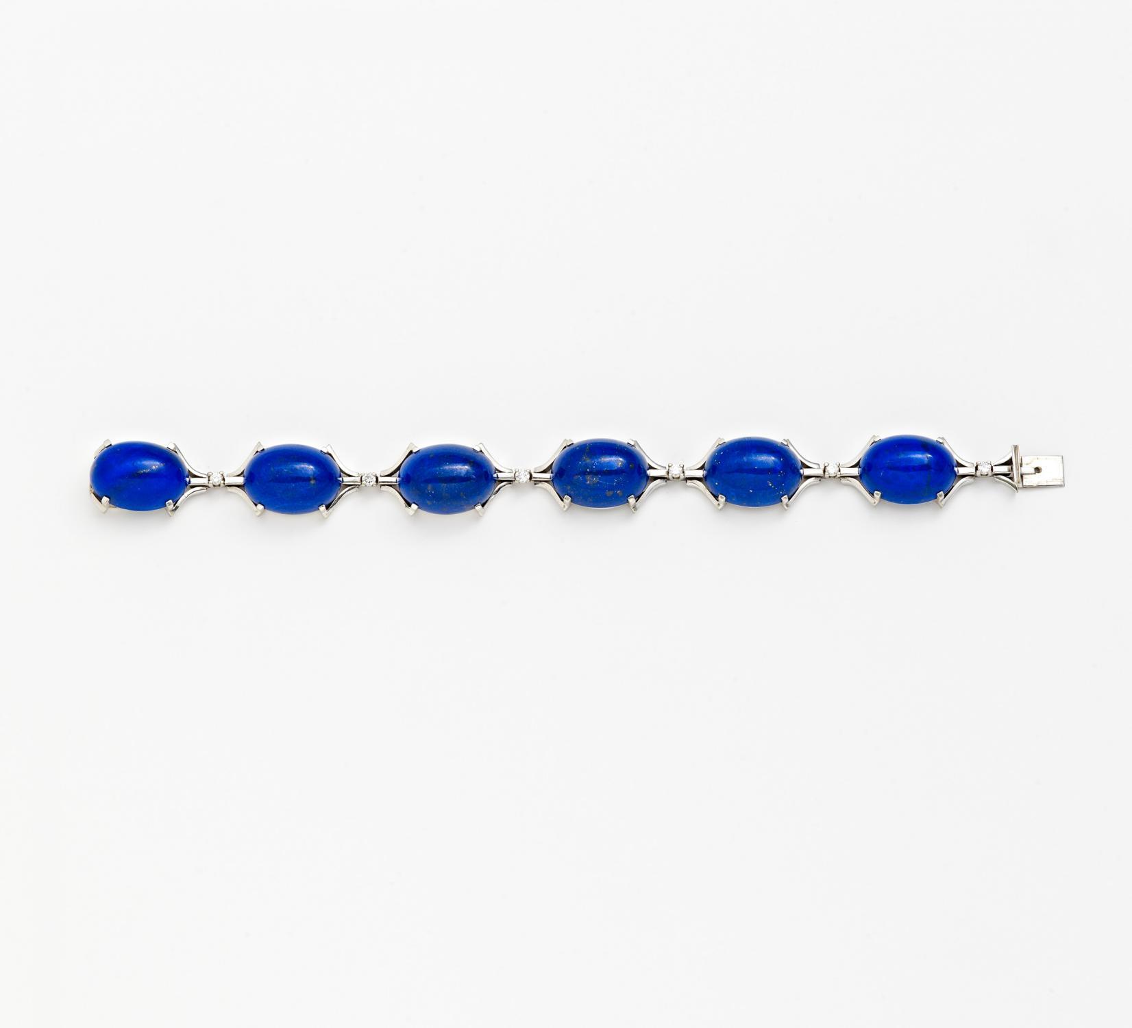 750/- Weißgold, gestempelt. 44,2g. 6 ovale Lapislazuli-Cabochons D. 18 x 13mm, 6 winzige Brillanten, L x B=ca. 18,0 x 1,3cm.~ Sign. AP. Deutschland, um 1970.