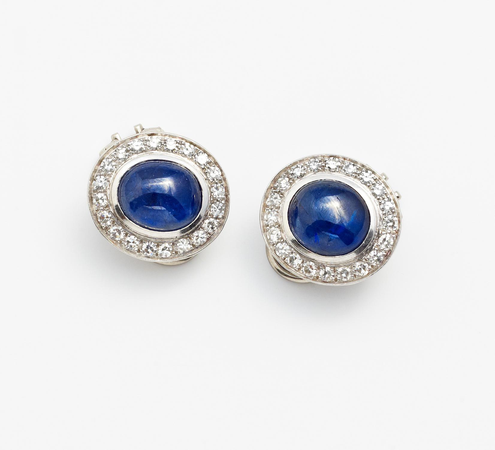 Weißgold. 8,5g. 2 ovale Saphir-Cabochons D. 8 x 7mm, 40 winzige 8/8-Diamanten, H x B=ca. 14 x 13mm.~
