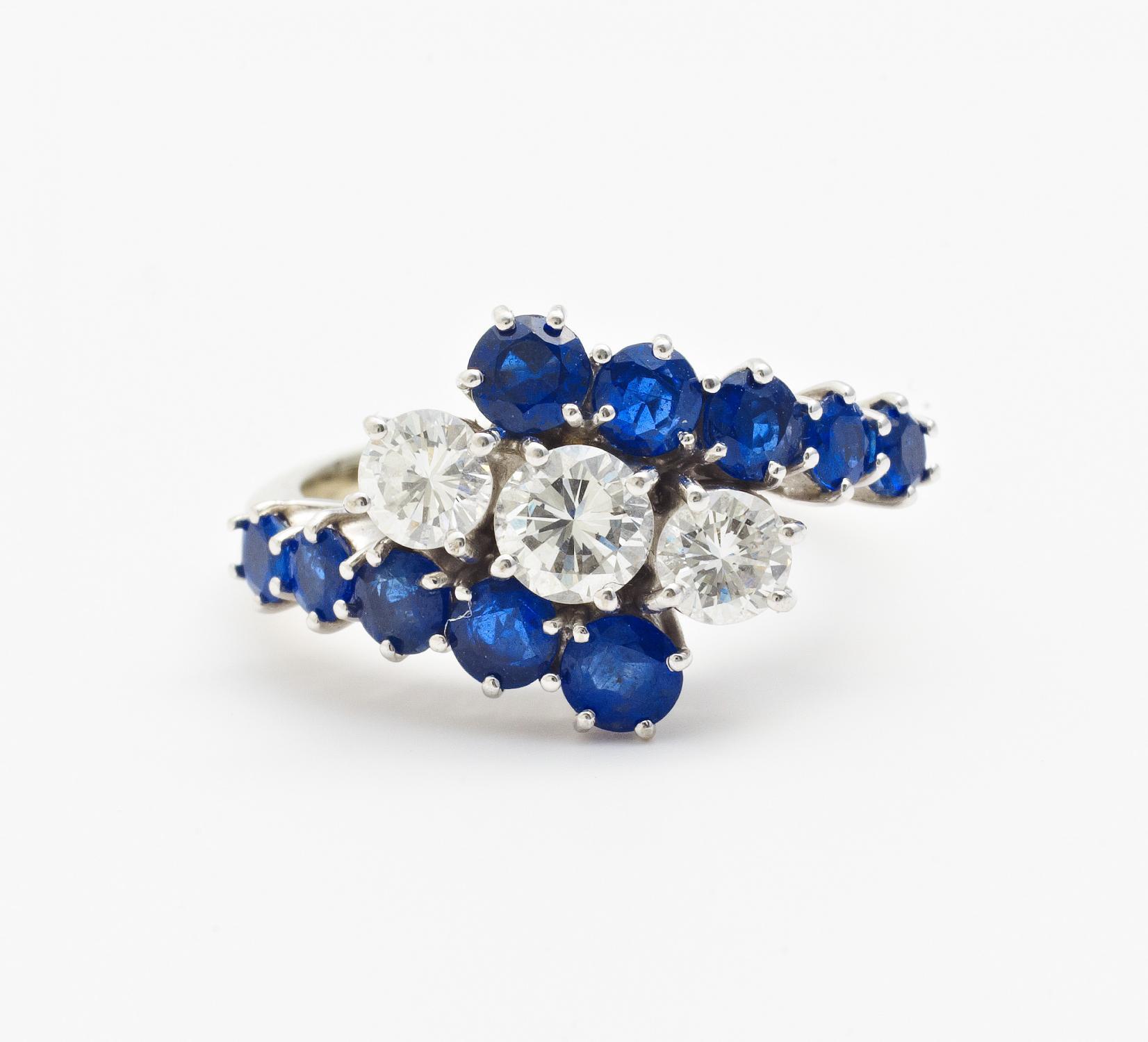 750/- Weißgold, gestempelt. 4,2g. 10 rund facettierte Saphire (beh.) D. 2-3mm, 3 Brillanten D. 4-4,6mm, EU-RM: 51,5. Ringtop: H x B=2-11 x 21mm.~ Deutschland, um 1970.