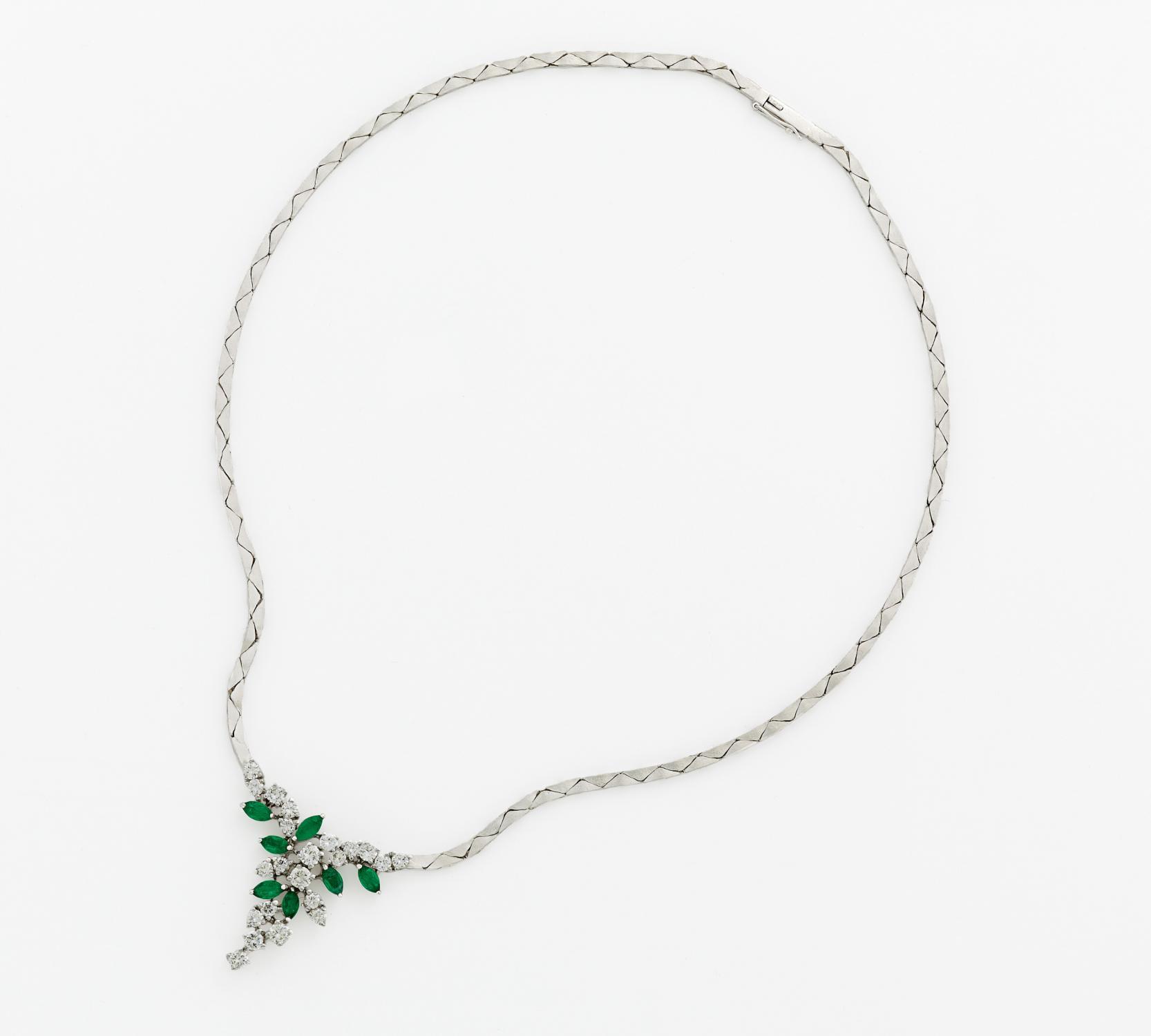 750/- Weißgold. 35,3g. 6 facettierte Smaragd-Tripletten im Navetteschliff (synth. Spinell/grüne Folie/synth. Spinell), 23 Brillanten D. ca. 3,0-3,5mm, L. 44,0cm, Mittelstück: H x B=2,9 x 3,8cm.~ Eine Triplette fehlend. Mittelstück teils beweglich.