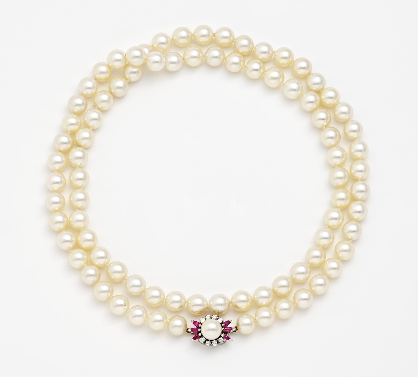 Verschluss: 585/- Weißgold, gestempelt. 82,2g. 6 winzige Rubin-Navettes, 8 winzige Brillanten, 84 Akoya-Zuchtperlen D.8,5-8,8mm, weiß-cremé. L. 79,5cm.~ Sehr feine Perlen.