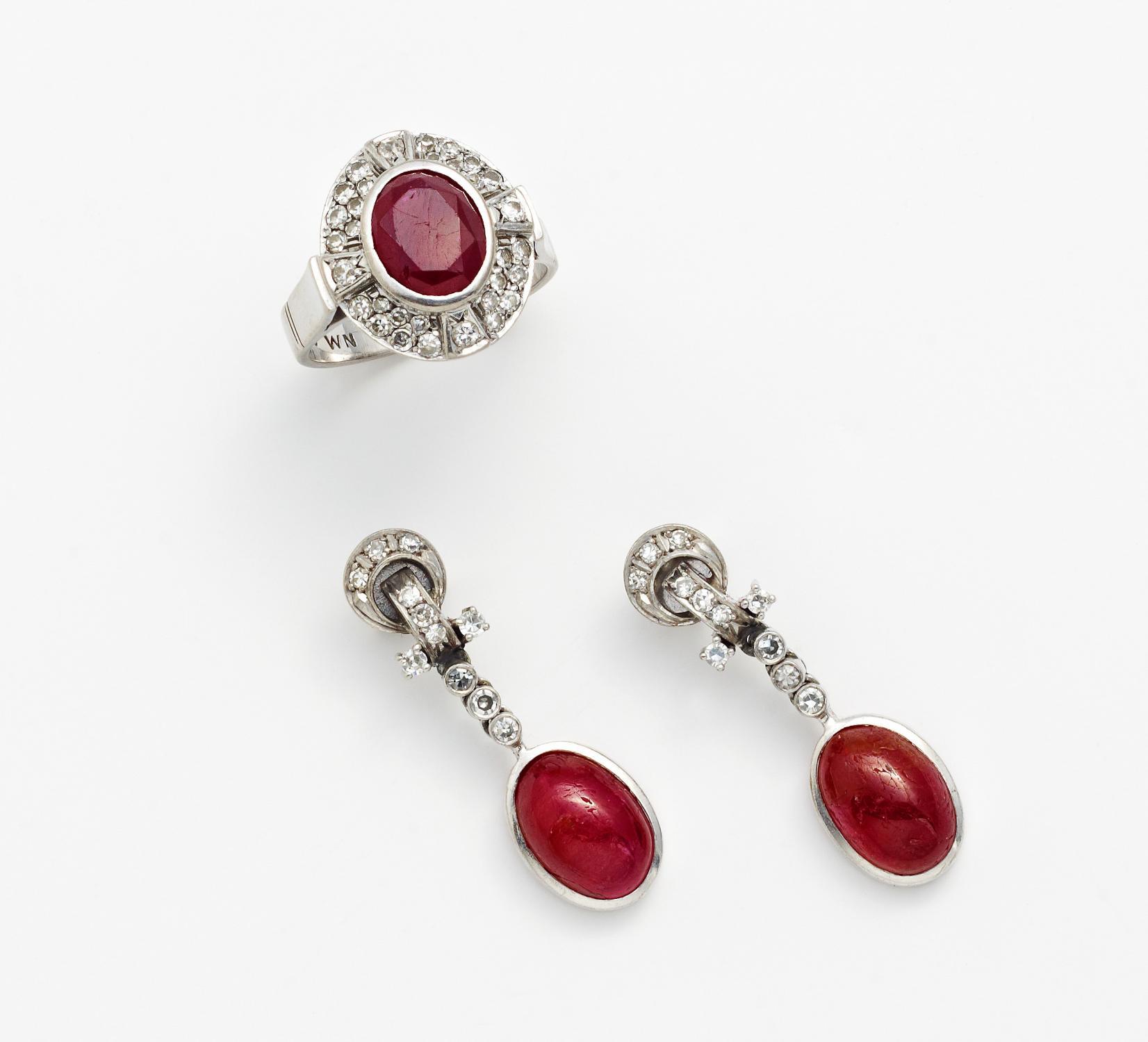 Ring: 585/- Weißgold, gestempelt; Ohrgehänge: Silbern. 8,0g, 10,1g. 1 oval facettierter Rubin, 2 ovale Rubin-Cabochons (teils mit Gebrauchsspuren), ca. 50 8/8 Diamanten, EU-RM: 54. Ringtop: H x B=1,6 x 1,5cm, Ohrg.: L x B=3,1 x 0,9cm.~ Ring sign. WN.