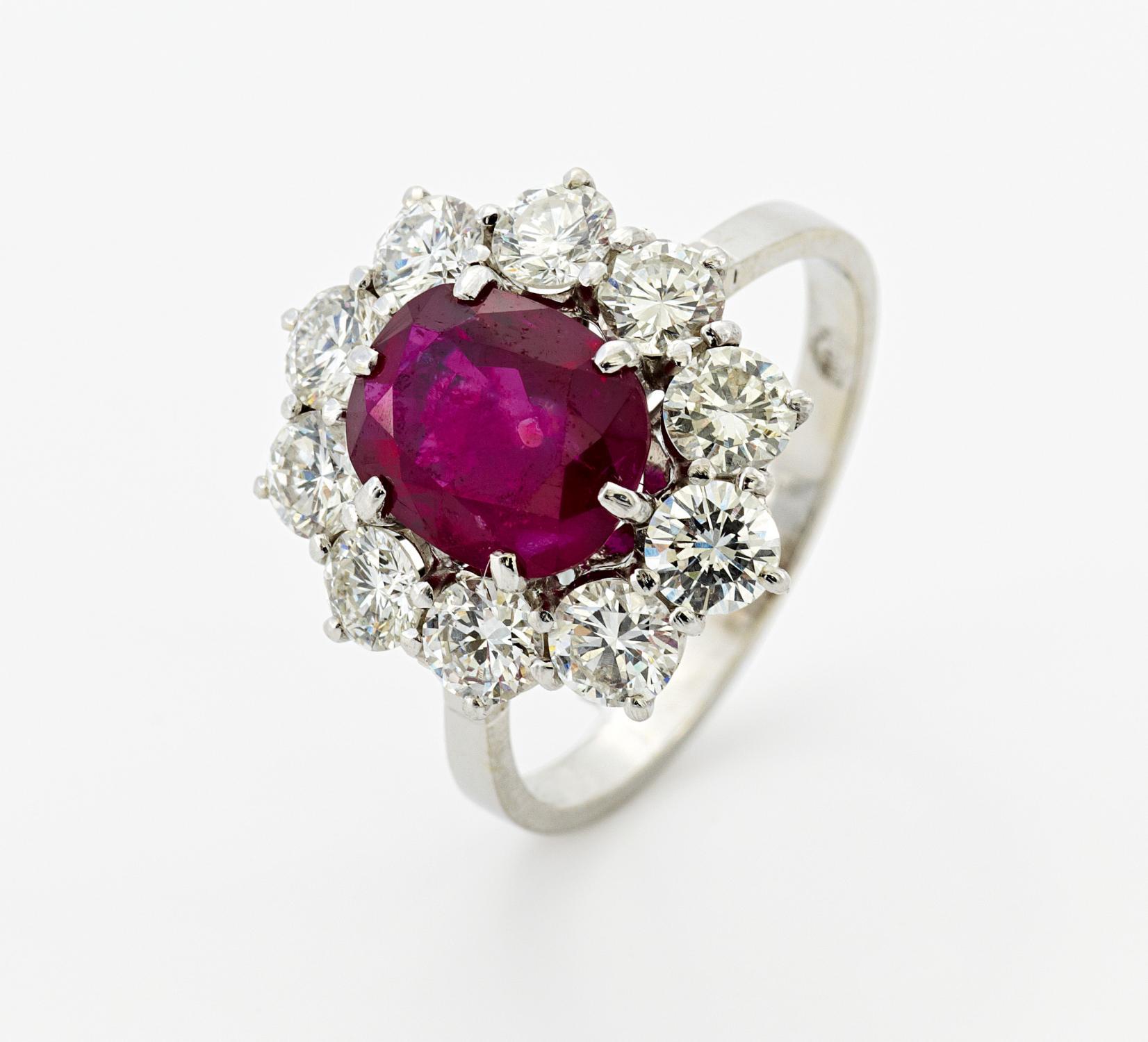 750/- Weißgold, gestempelt. 3,8g. 1 oval facettierter Rubin D. 9,17 x 7,54mm (behandelt), 10 Brillanten D. ca. 3,9mm, EU-RM: 56. Ringtop: H x B=17,5 x 14,3mm.~