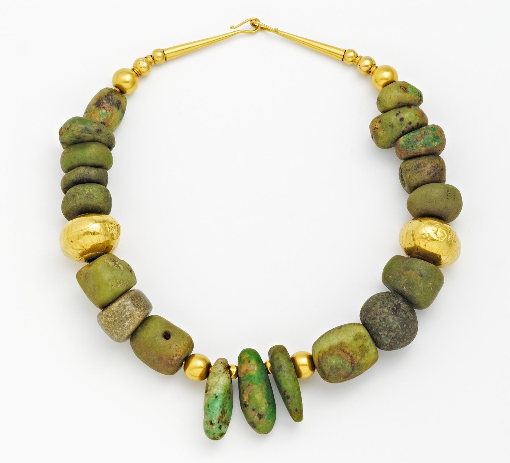 Verschluss: Goldfarben, goldfarbene Zwischenelemente. 295,1g. 19 Amazonit-Kugeln /-Scheiben D.ca. 21-37mm, L. 50,0cm.~