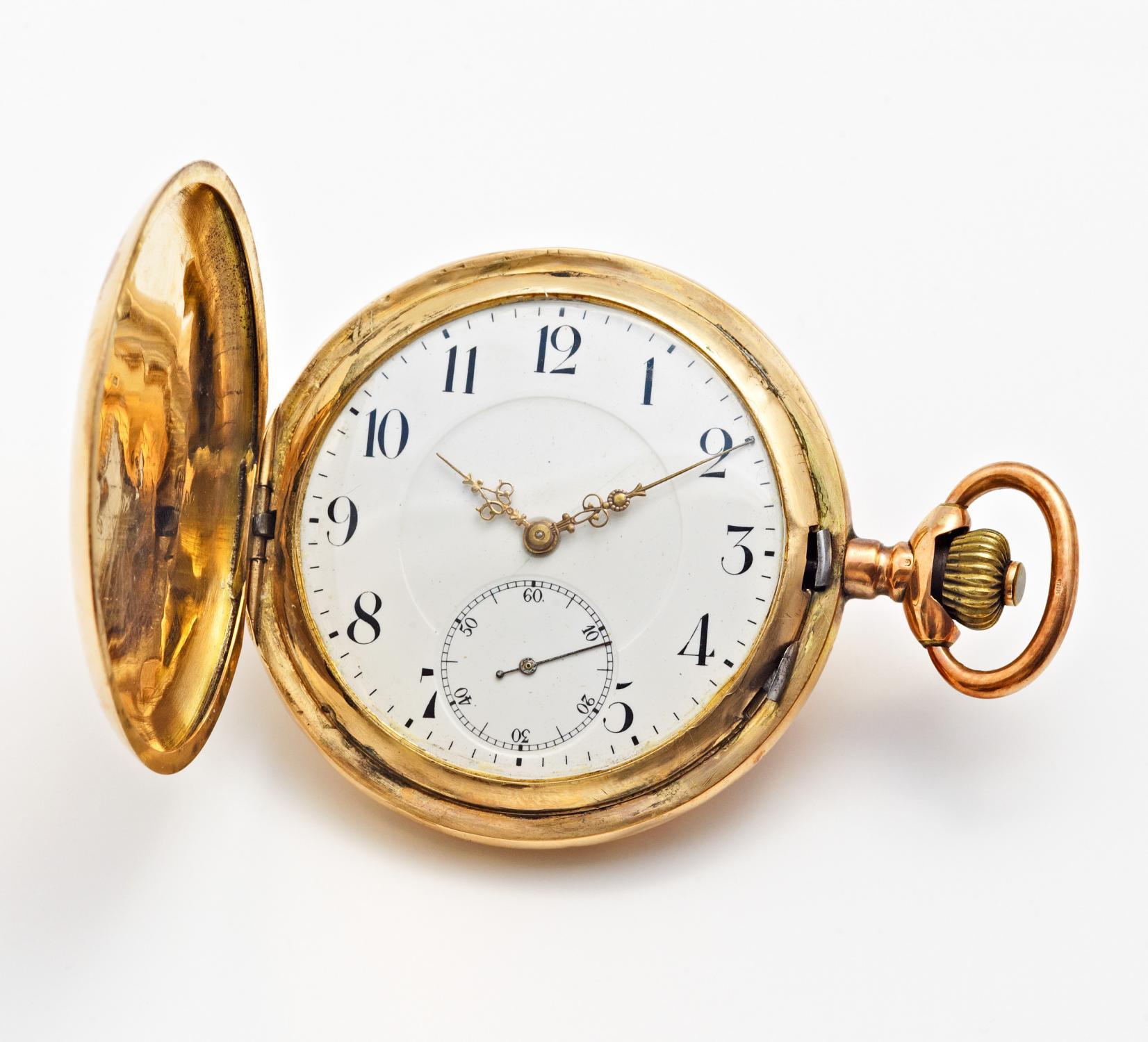 Taschenuhr. Gehäuse-Nr.: 13829. Werk-Nr.: 13829, sign. A. Lange & Söhne Glashütte. Gehäuse: 585/- Rotgold, gestempelt, Emaille-Zffbl., goldene/silberne Zeiger, dez. Sekunde, Handaufzug. Zwischendeckel Metall sign. System Glashütte Levées Visibles N13829, Zffbl. unsigniert,