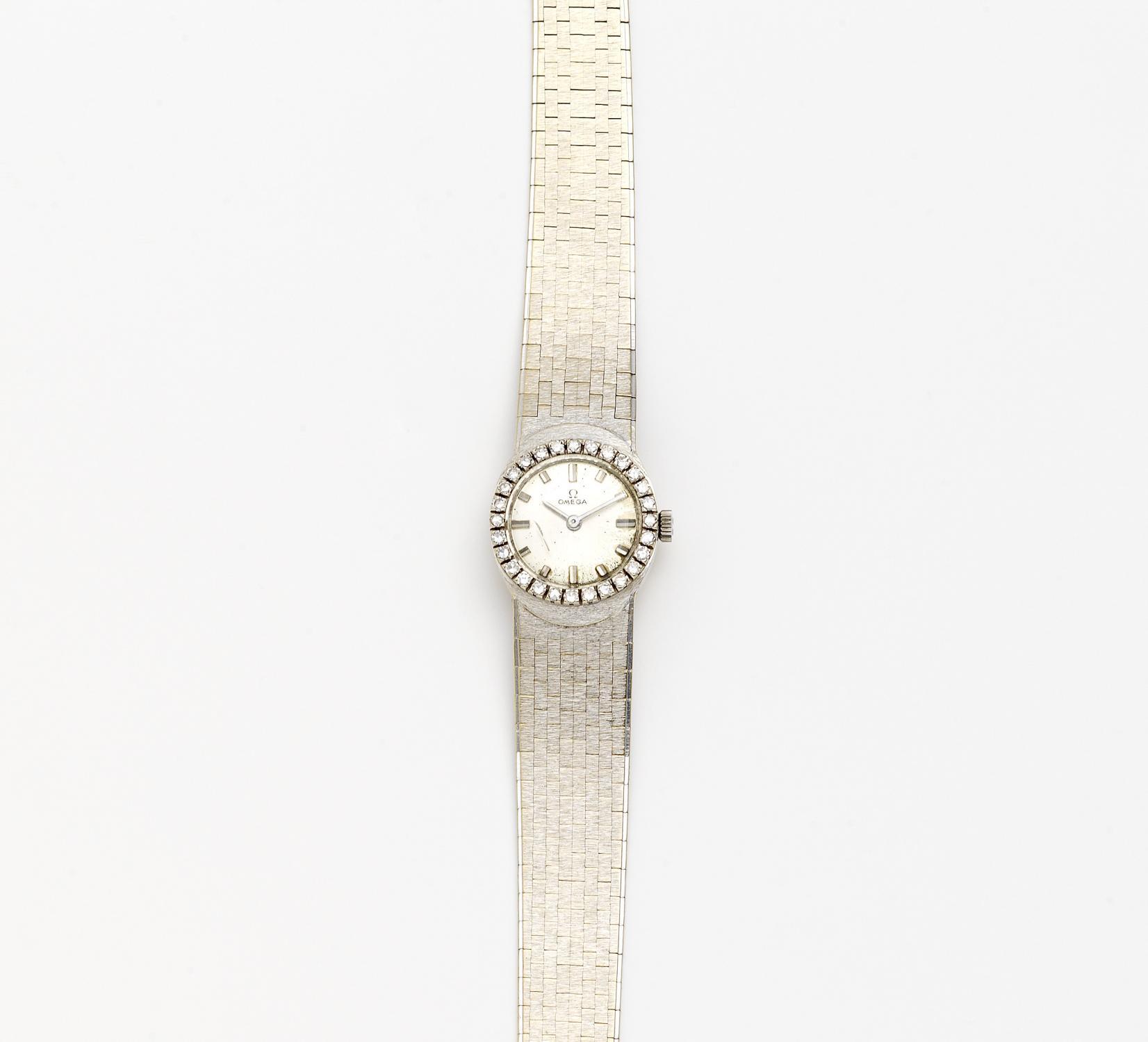 Cocktailarmbanduhr. Gehäuse: 750/- Weißgold, gestempelt, Ziffbl. silbern, silberne Zeiger/Indizes, Diamantlünette, Handaufzug. D. 21mm, L. 18,5cm. Gewicht: 42,2g.