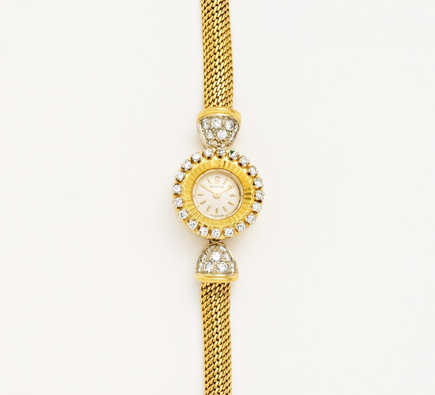 Cocktailarmbanduhr. Gehäuse-Nr.: 11407521. 750/- Gelbgold, gestempelt, Zffbl. weiß, goldene Indizes/Zeiger, Handaufzug (backwinder). 36 winzige Diamanten. Auf Verschluß "R.G. Kern Düsseldorf" gestempelt. D. 17mm, L. 16,5cm. Gewicht: 25,2g.