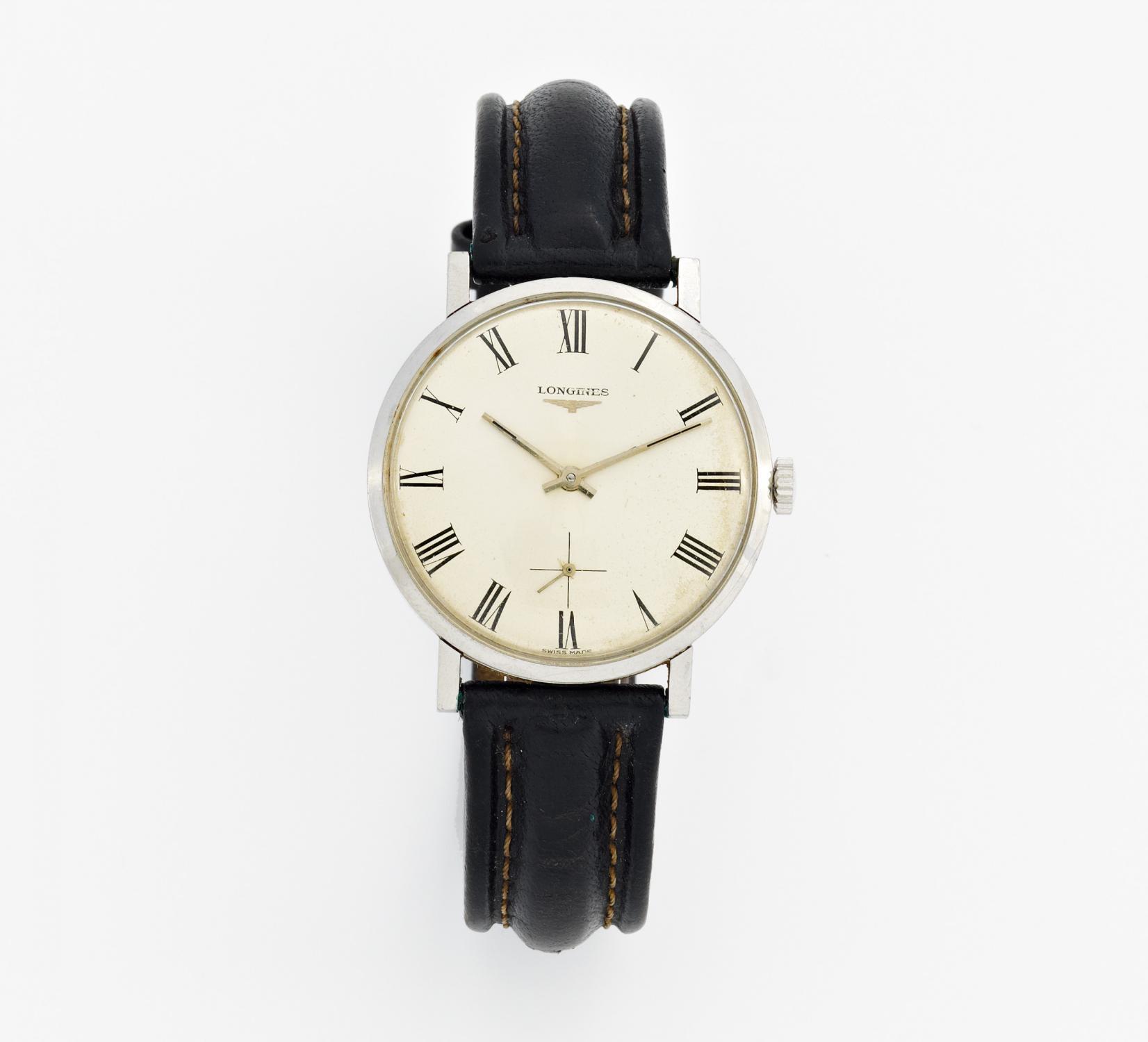 Herrenarmbanduhr. Gehäuse-Nr.: 355368. Gehäuse: Stahl, Lederarmband schwarz, silberne Dornschließe, Zffbl. silbern, silberne Zeiger, schwarze röm. Ziffern, dez. Sekunde, Handaufzug. D. 35mm, L. 23,0cm. Gewicht: 33,0g.