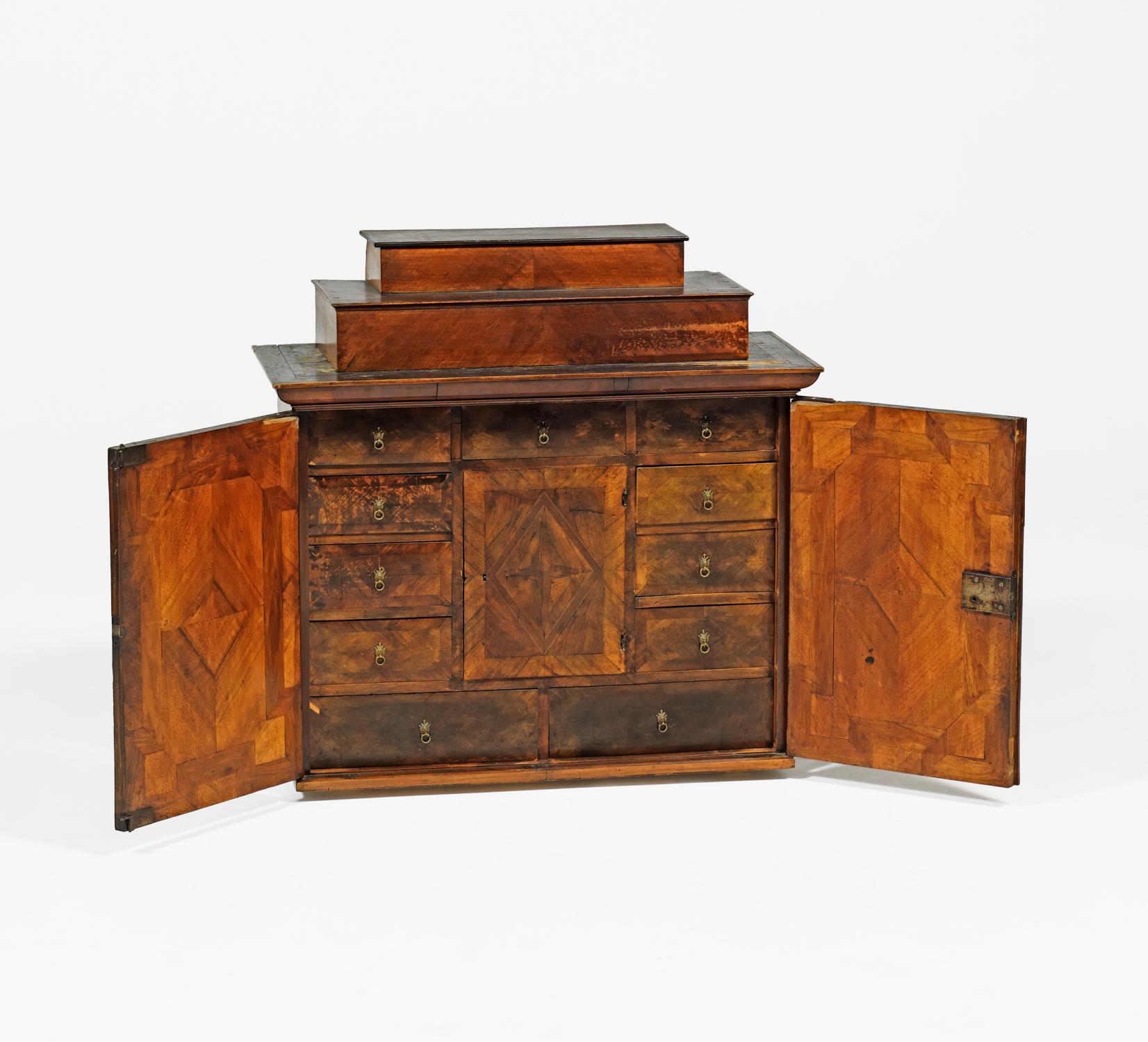 Nussbaum, poliert und eingelegt. 98x100,5x44,5cm. Zustand C.