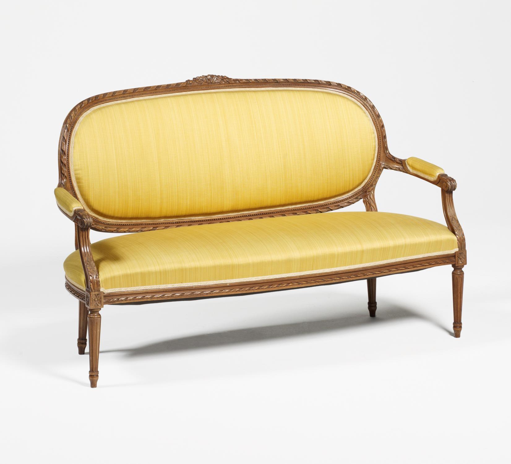 Buche geschnitzt. Gepolstert. 98x153x63cm. Zustand B.