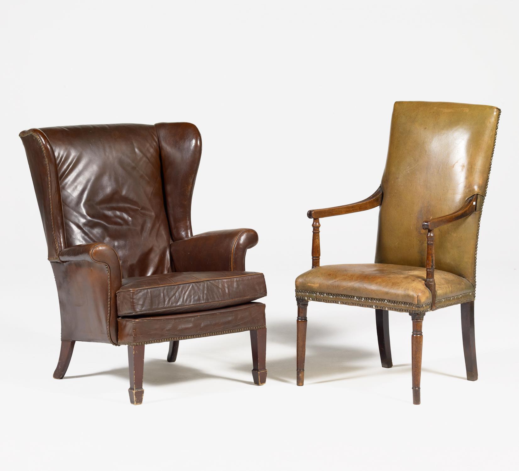 Mahagoni. Lederpolster. {Beil.:} Armlehnsessel mit Lederpolster. H.95cm. Zustand C.