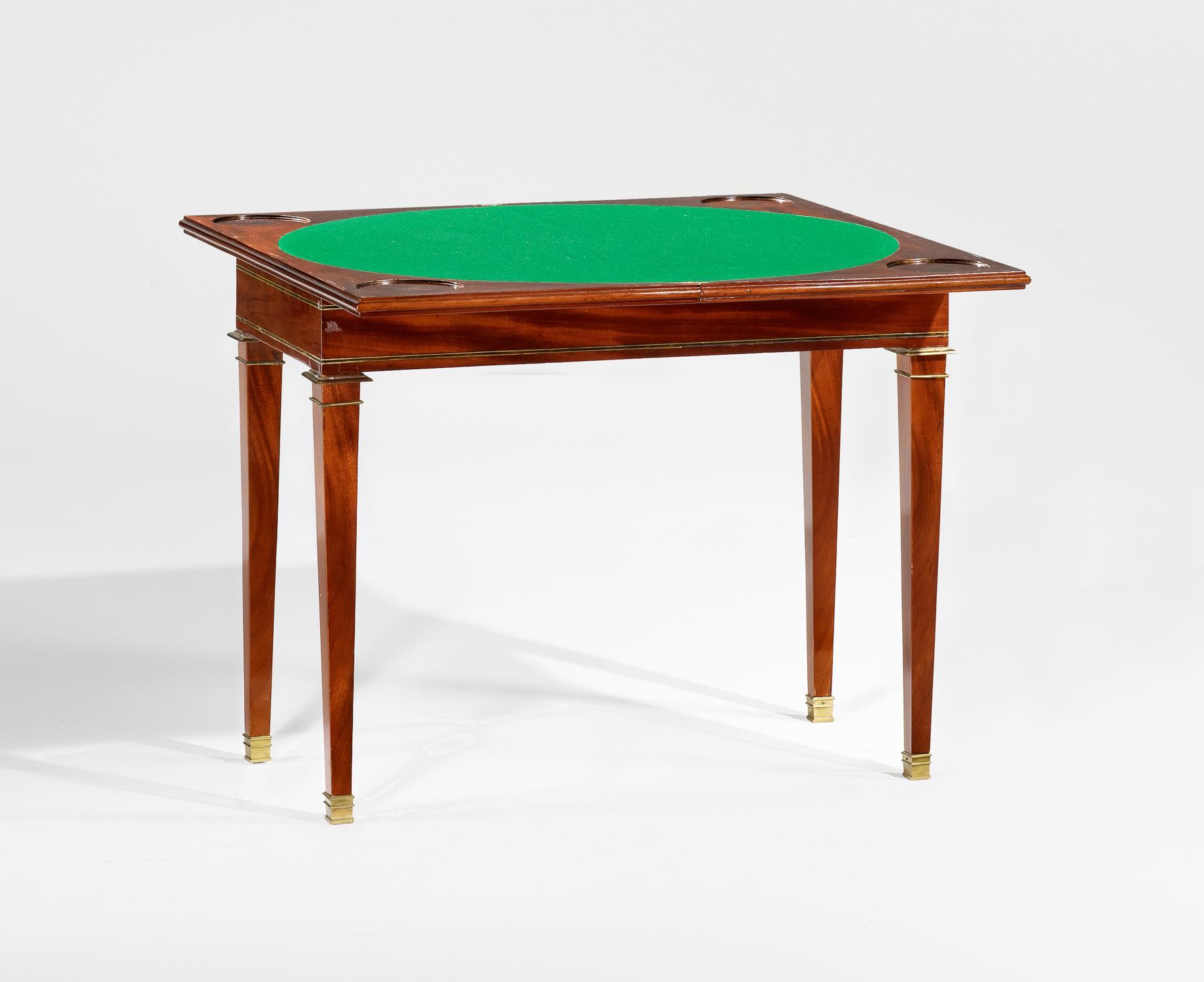 Mahagoni. Messingeinlagen. Aufklappbare Tischplatte. 73x86x44cm. Zustand B/C.