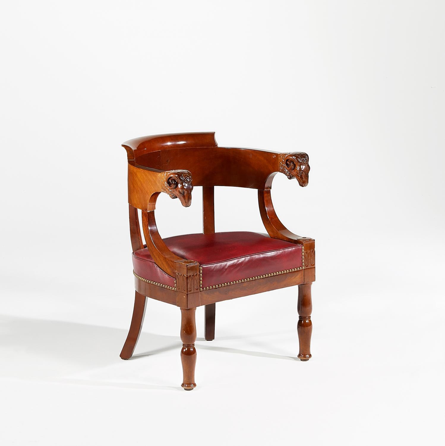 Mahagoni. Lederpolster. Armlehnen in Widderköpfen endend. H.79cm. Zustand B.