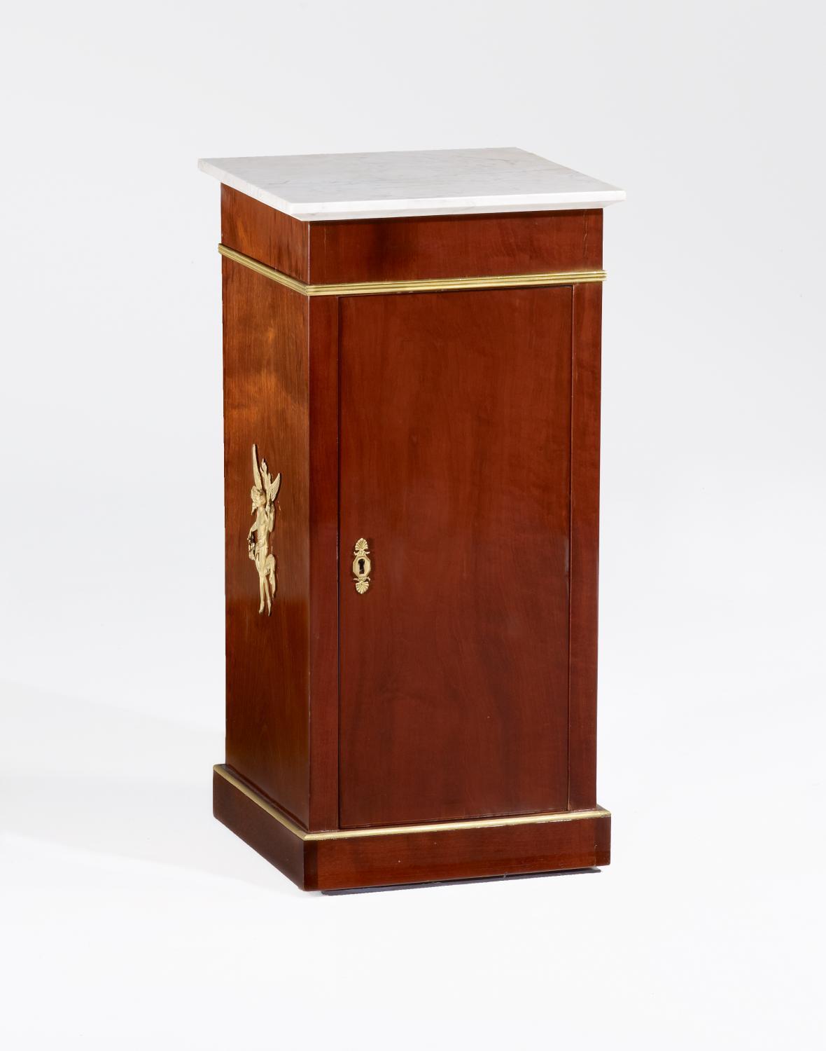 Mahagoni. Bronzeapplikationen. Marmorplatte. Auf Rollen. Innen marmorbelegter Regalboden. 91x45x45cm. Zustand B.