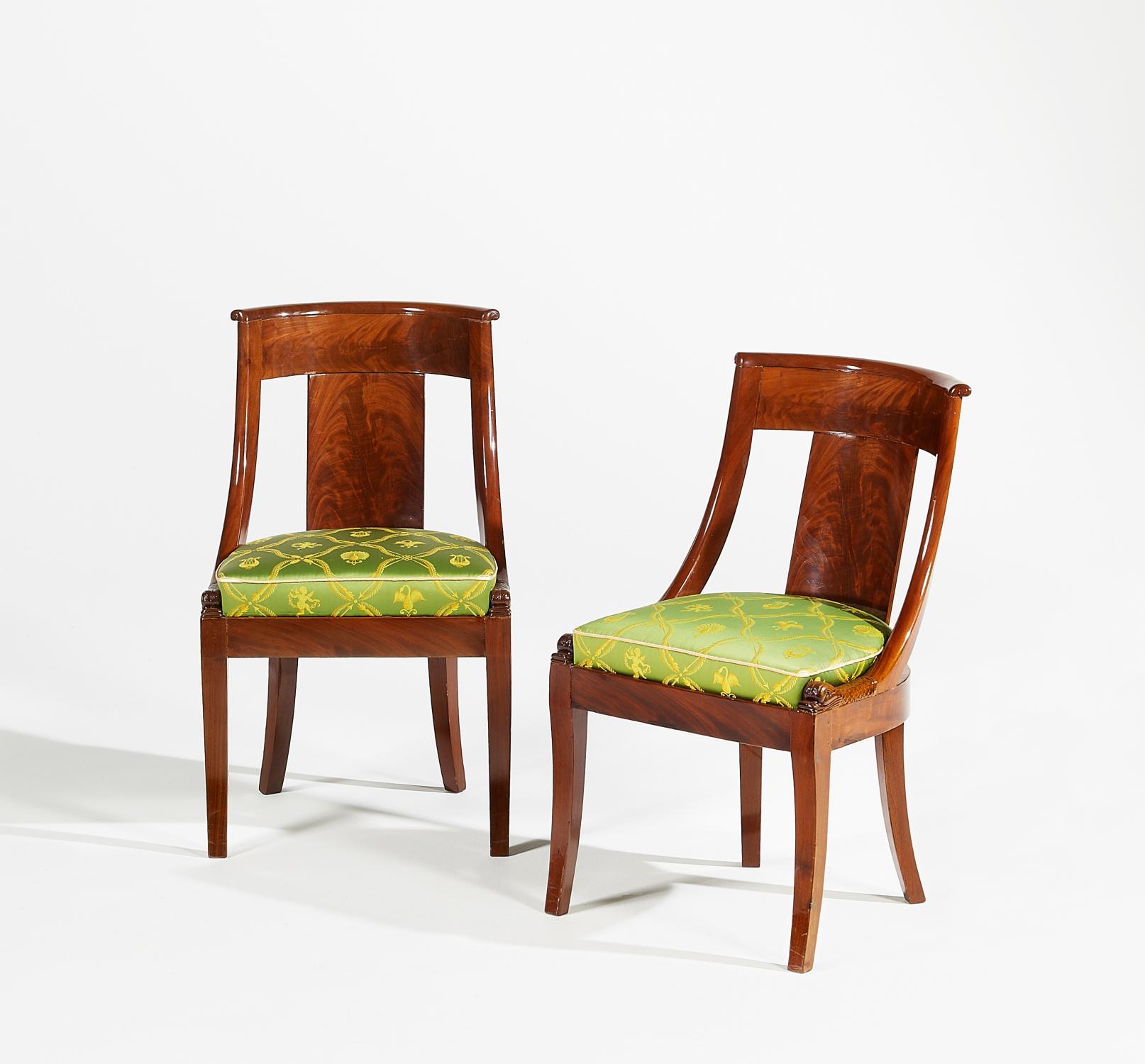 Mahagoni. Gepolstert. Armläufe in Tierköpfen endend. H. je 79cm. Zustand B.