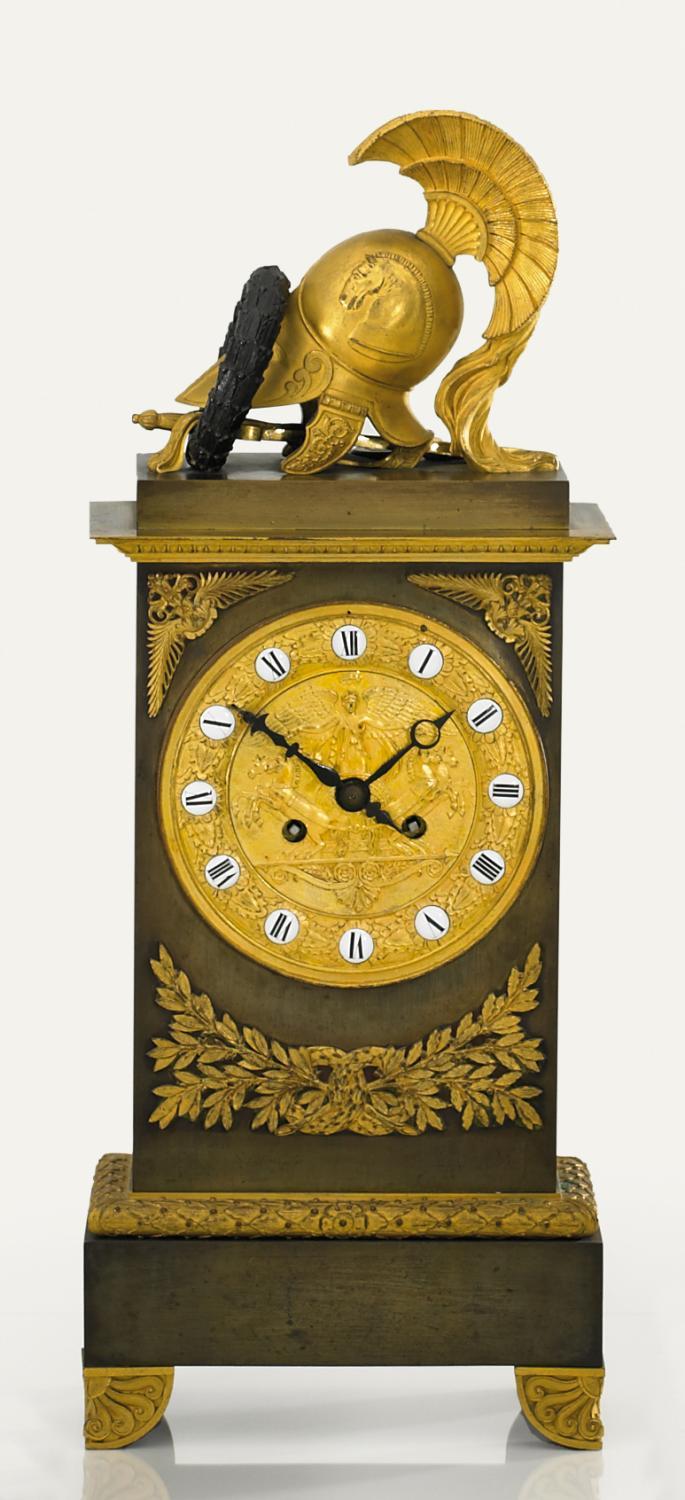 Bronze patiniert bzw. vergoldet. Applikationen und Helm des Perseus in Lorbeerkranz. Auf Emailzifferblatt Göttin Aurora.. H.58cm. Zustand B. Minutenzeiger ergänzt.