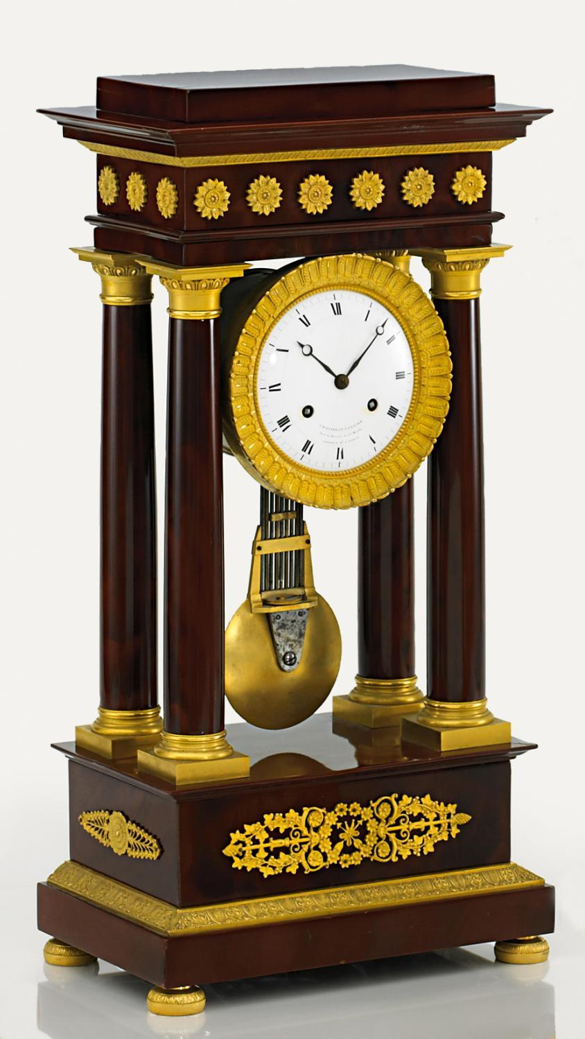 Mahagoni. Bronze. 14-Tage-Werk mit Federaufhängung und Halbstundenschlag auf Glocke, Kompensationspendel. H.60cm. Zustand B.