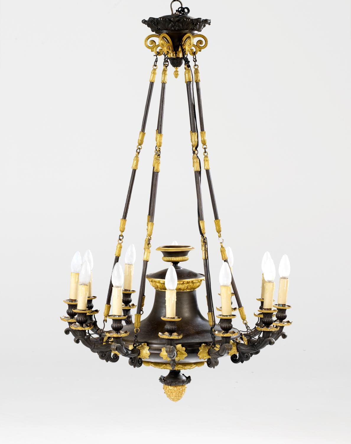 Bronze patiniert bzw. vergoldet. Kreiselförmiger Korpus mit Pinienzapfen und Kraterbekrönung. H.122cm, + 69cm. Zustand B/C. Nachträglich elektrifiziert. Zwölfflammig.