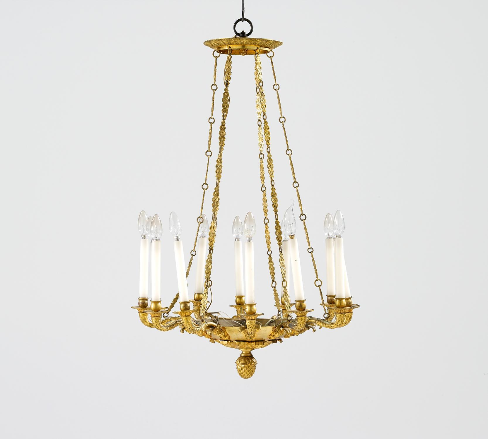 Bronze patiniert bzw. vergoldet. H.105cm, + 68cm. Zustand B/C. Nachträglich elektrifiziert. Zwölfflammig.