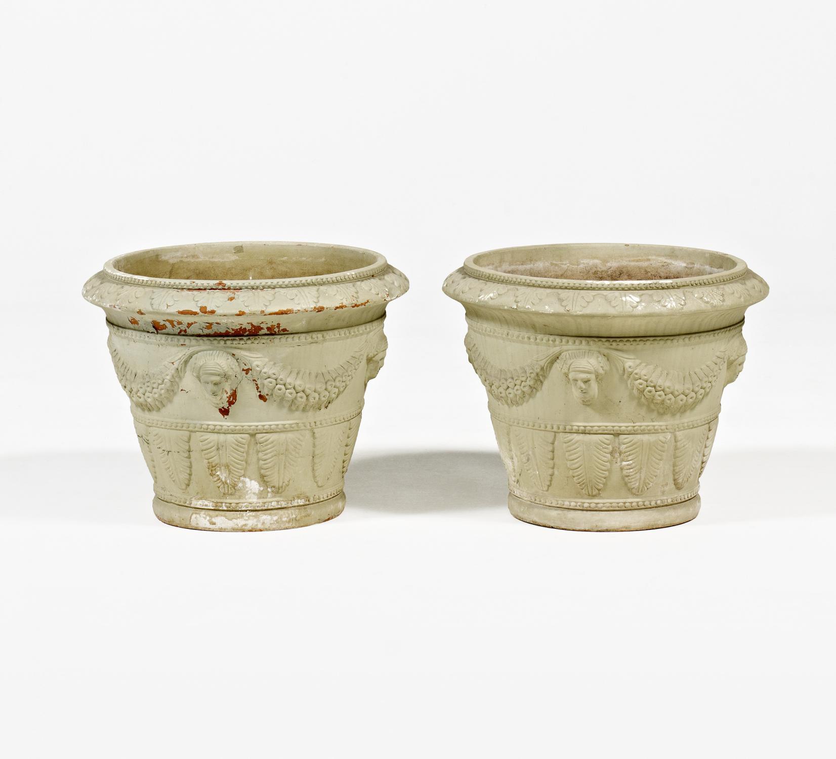 Terracotta grau bemalt. Antikisierender Dekor. H.49cm, + 63cm. Zustand C.
