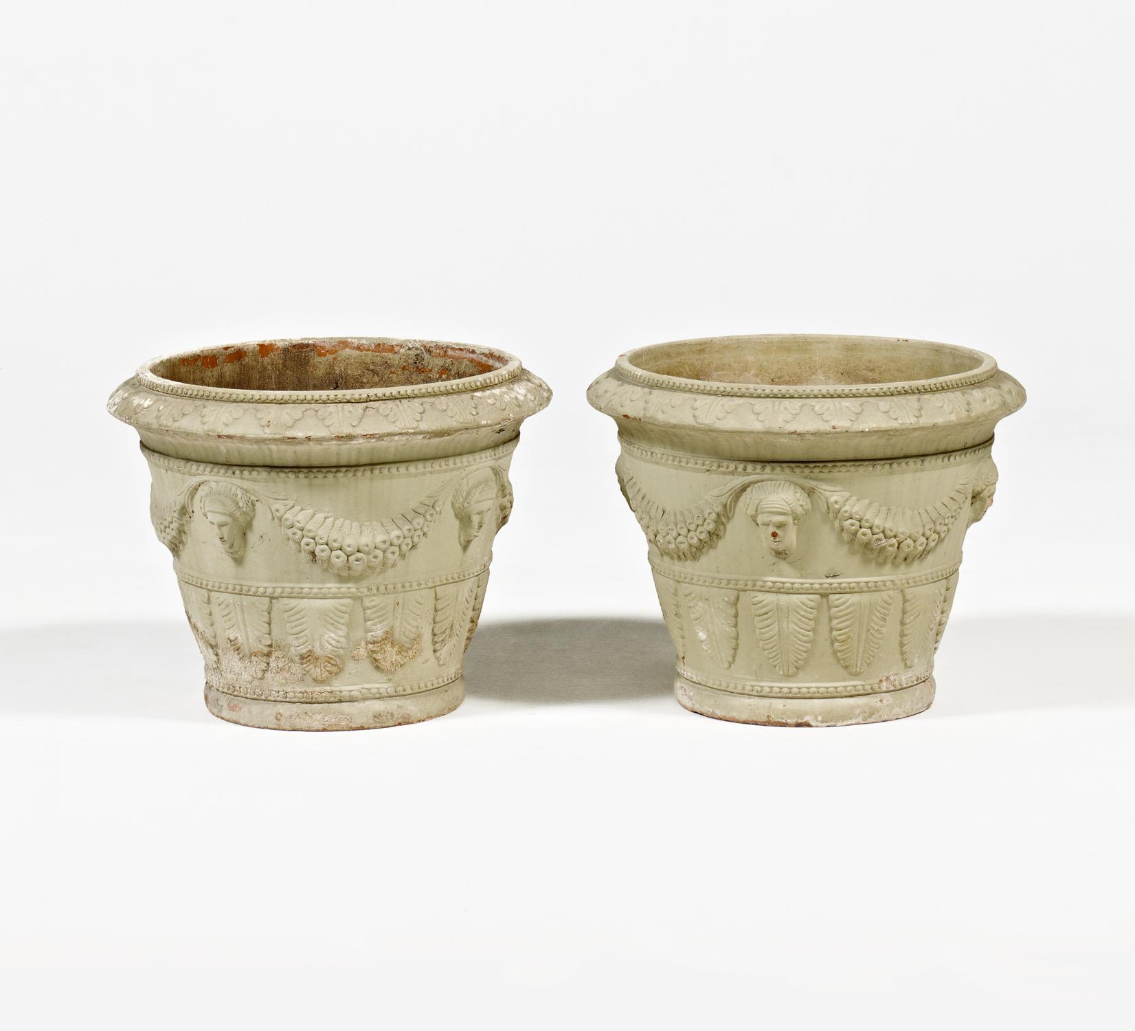 Terracotta grau bemalt. Antikisierender Dekor. H.49cm, + 63cm. Zustand C.