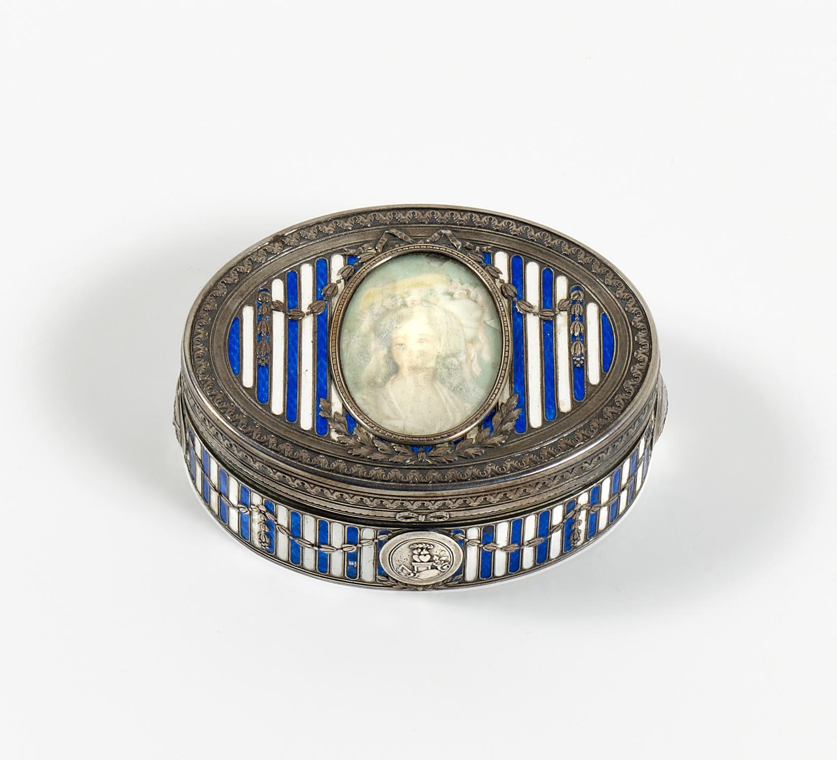 Silber, blaues und weißes Email. Miniatur. H.3,5cm. Zustand B.