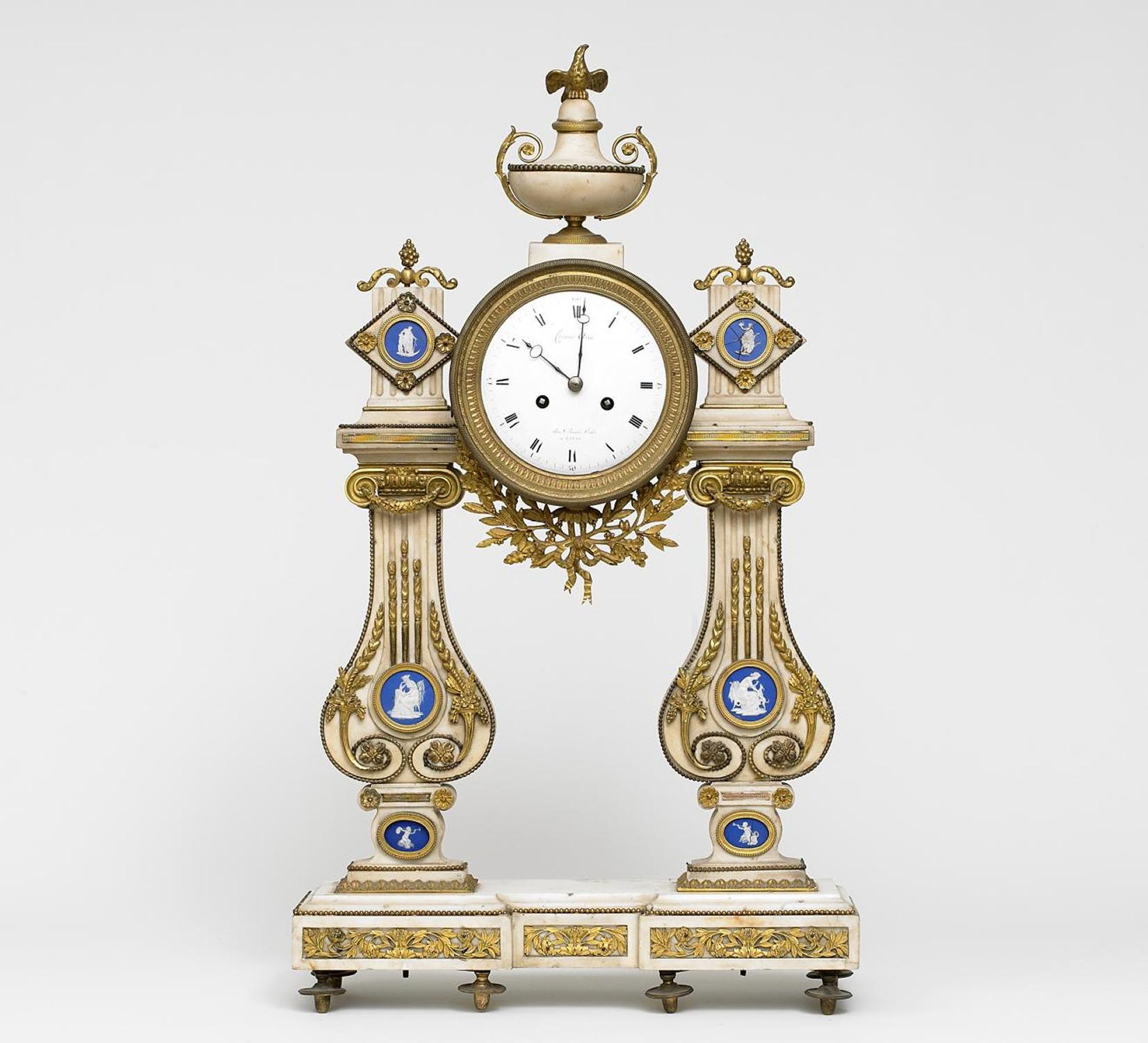 Weißer Marmor, Bronze vergoldet. Porzellanplaketten. H.78cm. Zustand C. Pendel verloren.