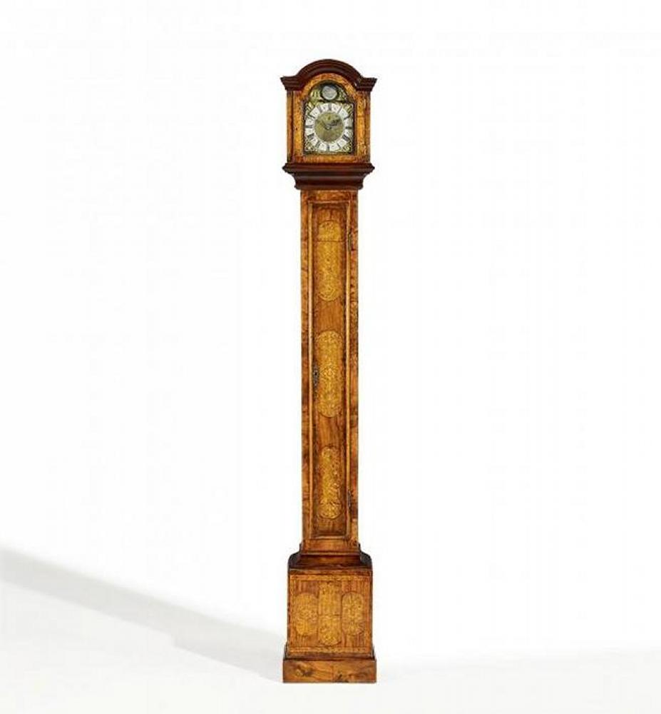 Nussbaum, Ahorn poliert und ornamental eingelegt. Messingzifferblatt mit ornamentalem Dekor. Tagesläufer-Gehwerk. H. 185cm. Zustand B. P/G.
