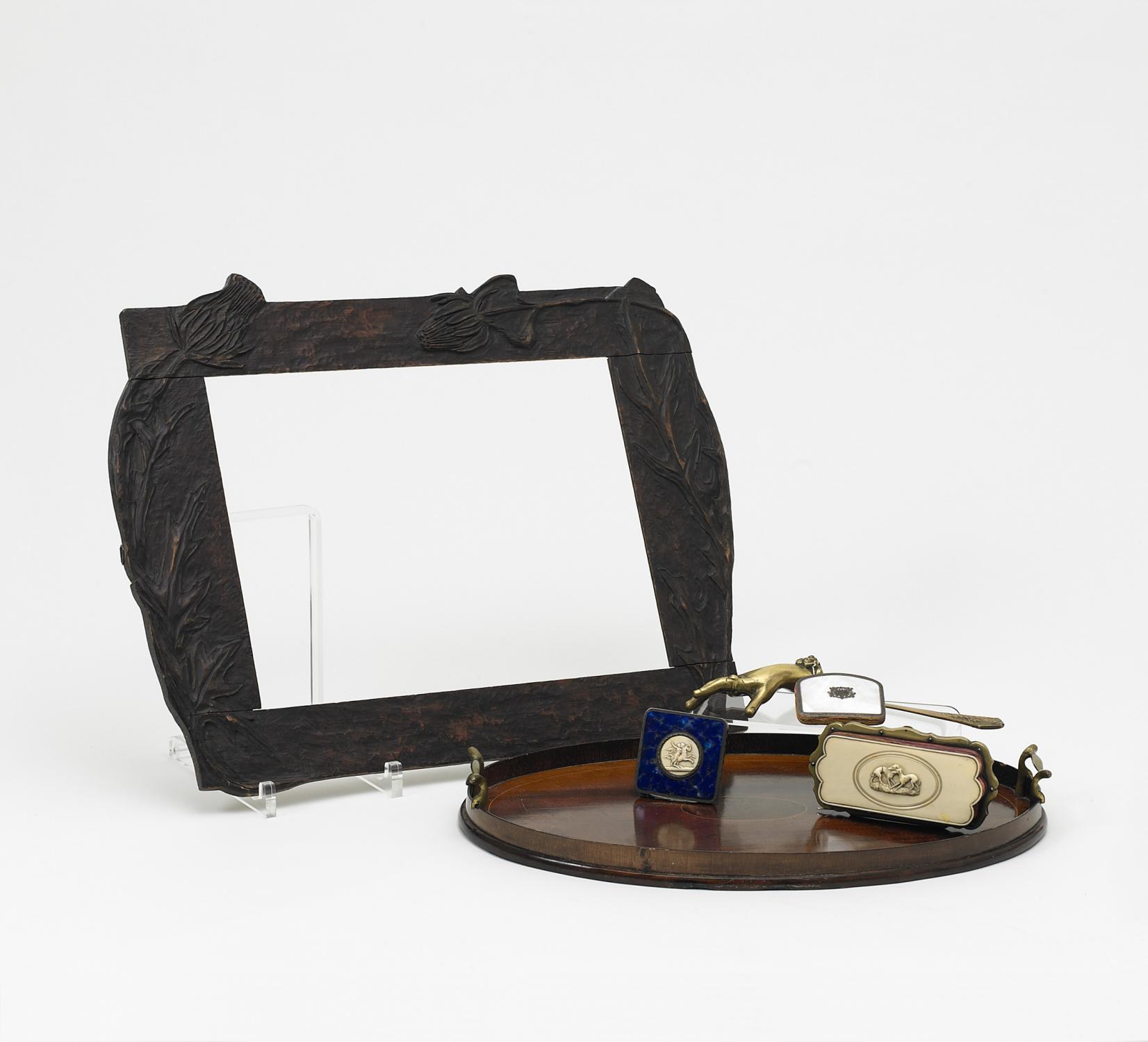 Holz, tlw. geschnitzt, Bronze, Perlmutt, Stoff, Metall u.a. Best. aus Tablett, Jugendstilrahmen, Briefbeschwerer in Form einer Hand, Brieföffner, 2